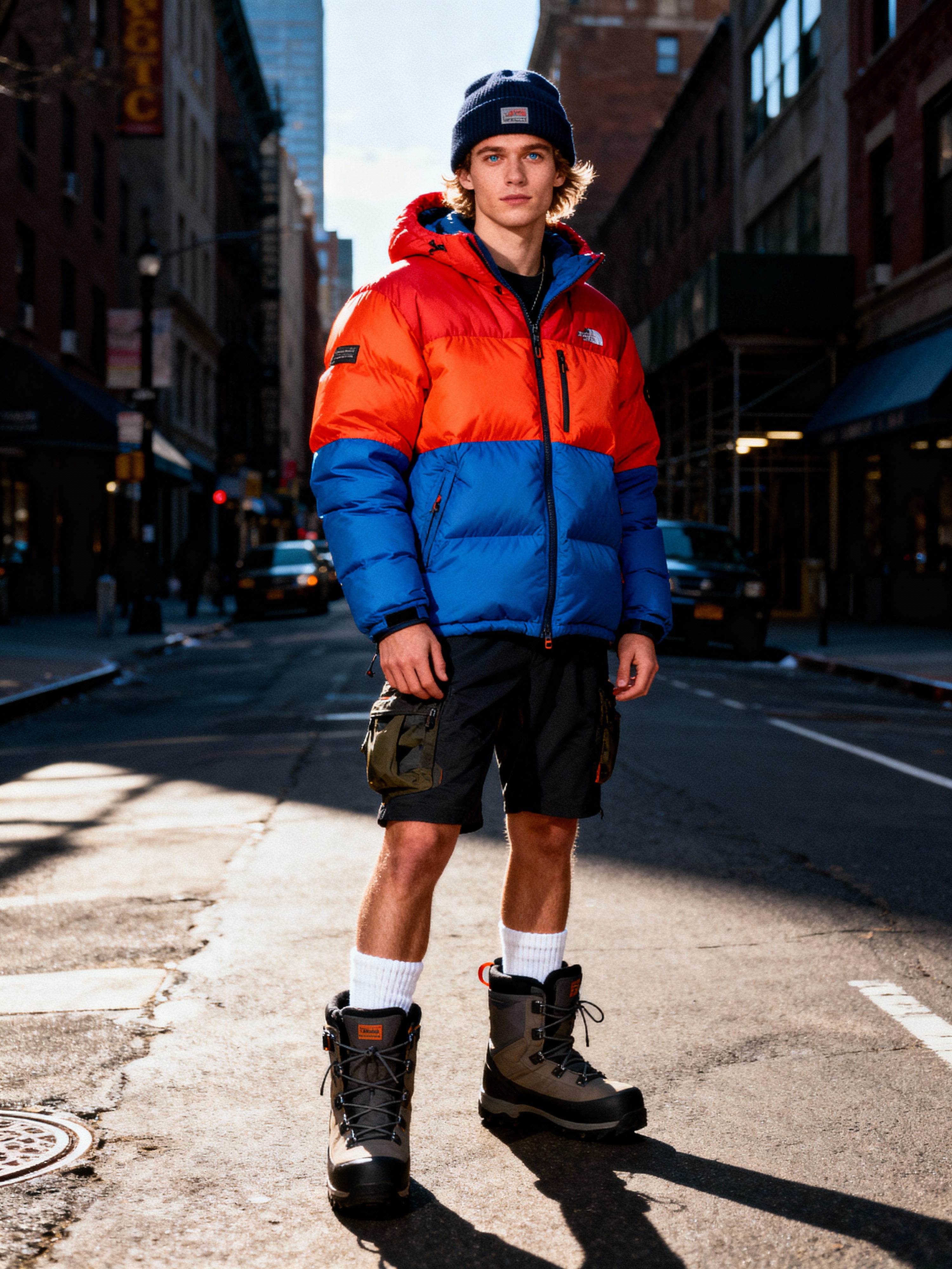 model wearing gorpcore aesthetic, functional outdoor clothing, bright colored puffer jacket, moonboots, beanie, white wool socks, outerwear, posing for photo in the street