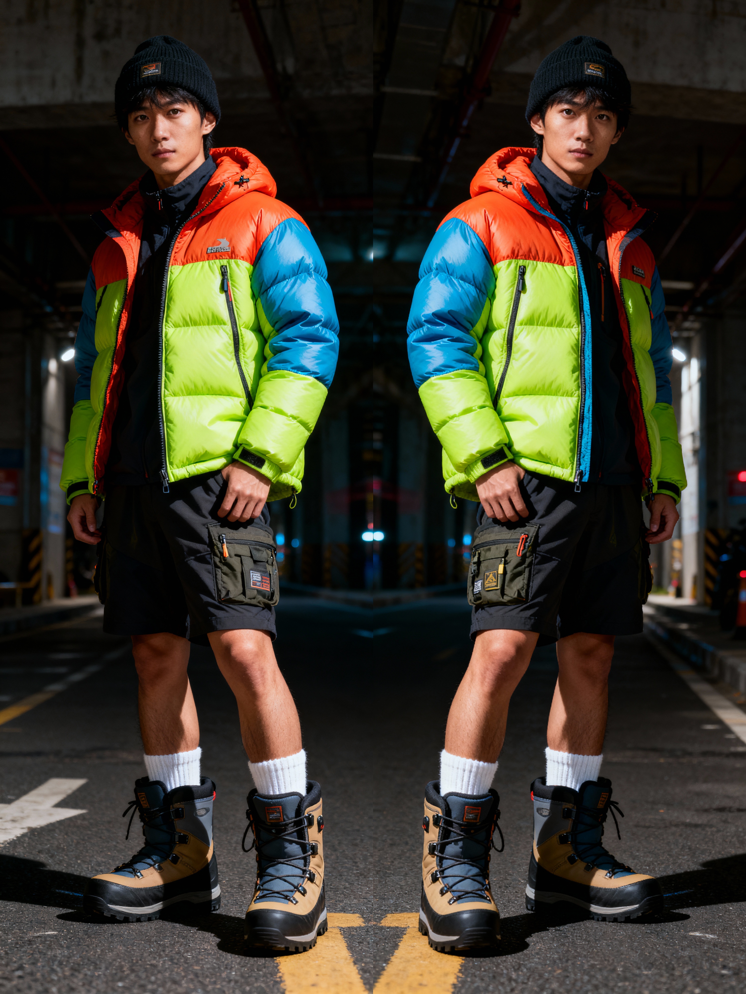 model wearing gorpcore aesthetic, functional outdoor clothing, bright colored puffer jacket, moonboots, beanie, white wool socks, outerwear, posing for photo in the street