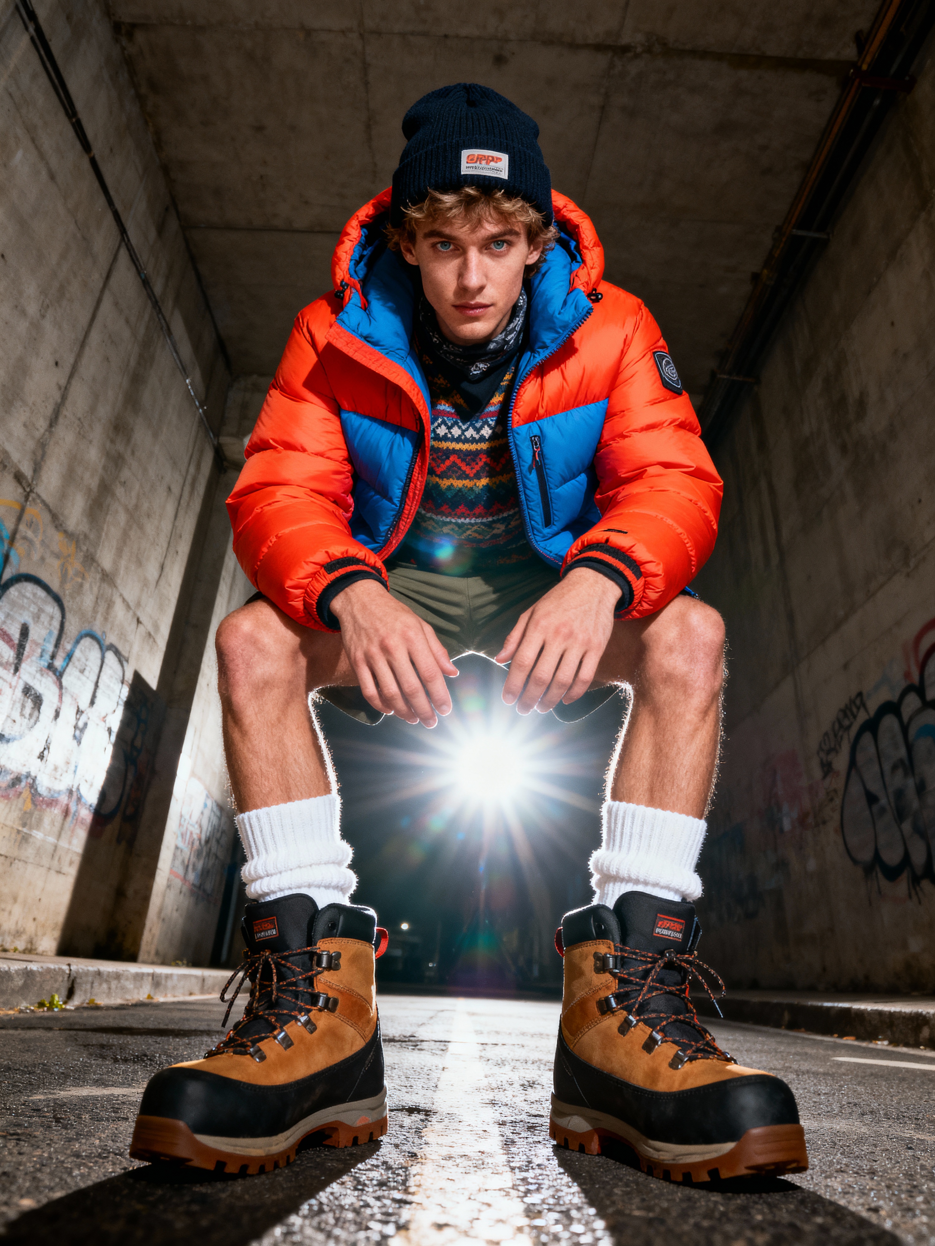 model wearing gorpcore aesthetic, functional outdoor clothing, bright colored puffer jacket, moonboots, beanie, white wool socks, outerwear, posing for photo in the street
