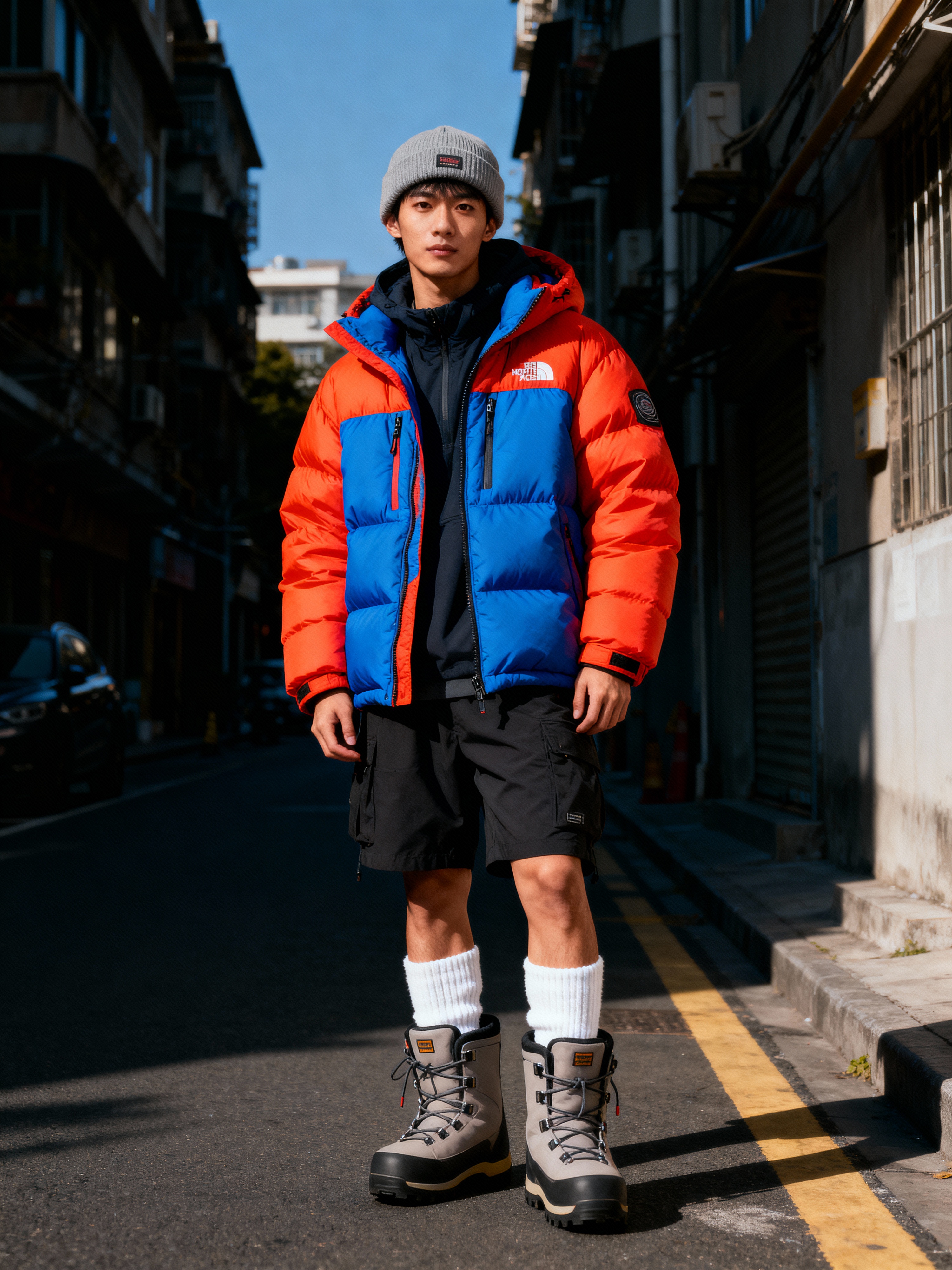 model wearing gorpcore aesthetic, functional outdoor clothing, bright colored puffer jacket, moonboots, beanie, white wool socks, outerwear, posing for photo in the street