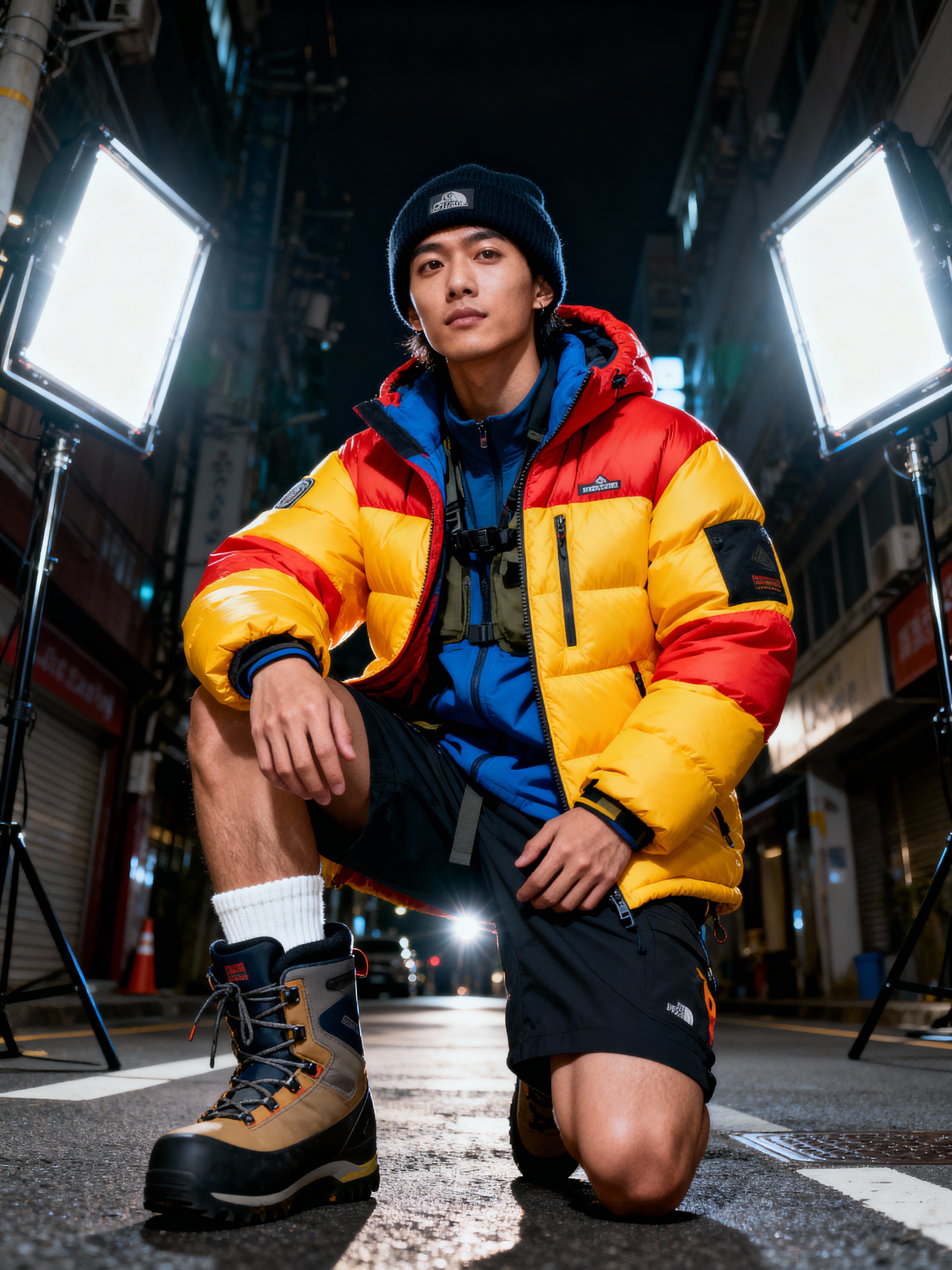 model wearing gorpcore aesthetic, functional outdoor clothing, bright colored puffer jacket, moonboots, beanie, white wool socks, outerwear, posing for photo in the street