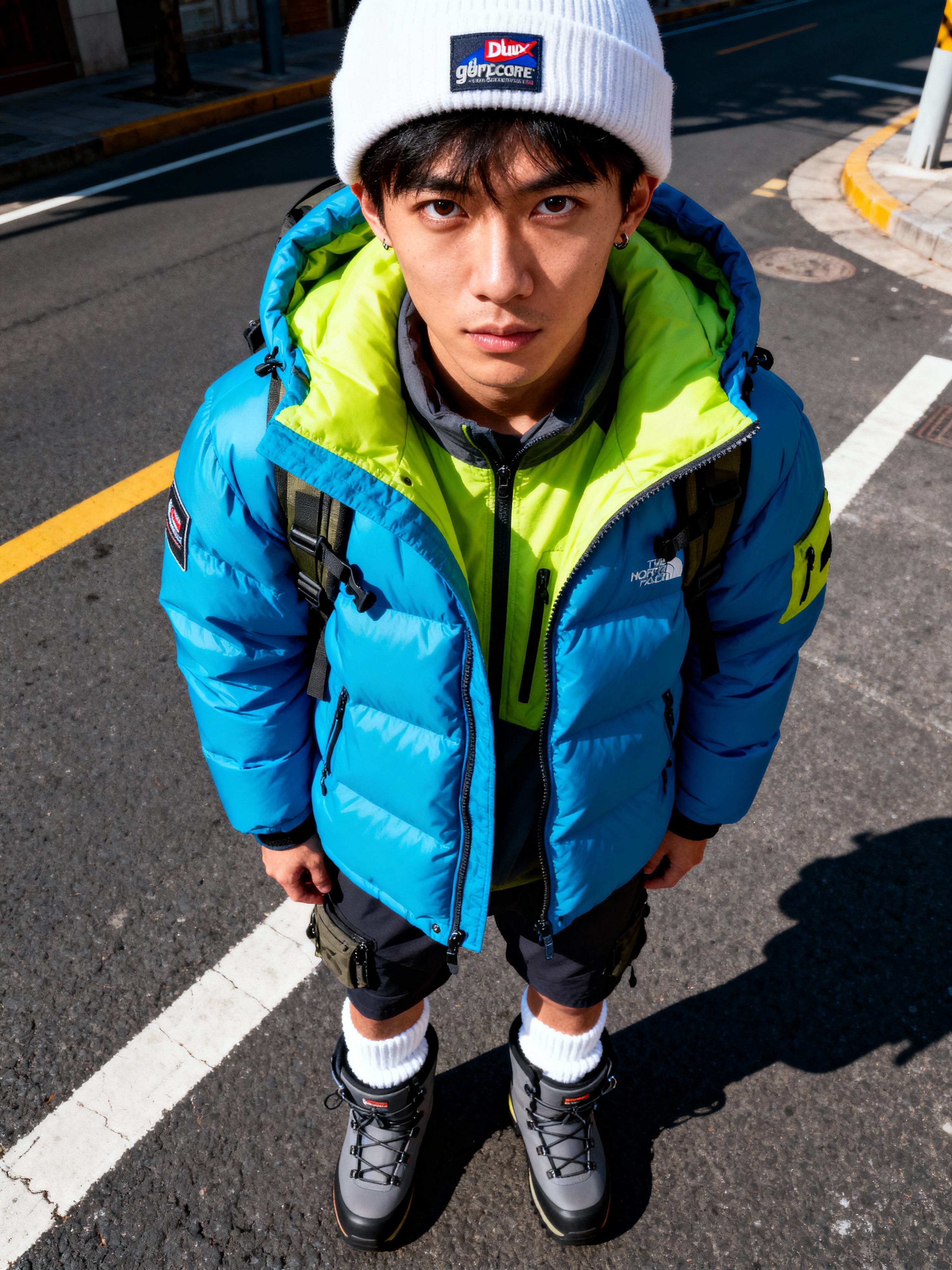 model wearing gorpcore aesthetic, functional outdoor clothing, bright colored puffer jacket, moonboots, beanie, white wool socks, outerwear, posing for photo in the street