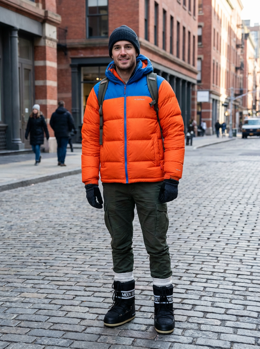 model wearing gorpcore aesthetic, functional outdoor clothing, bright colored puffer jacket, moonboots, beanie, white wool socks, outerwear, posing for photo in the street