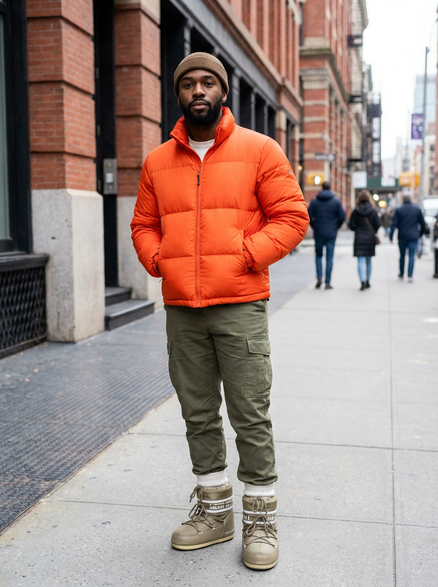 model wearing gorpcore aesthetic, functional outdoor clothing, bright colored puffer jacket, moonboots, beanie, white wool socks, outerwear, posing for photo in the street