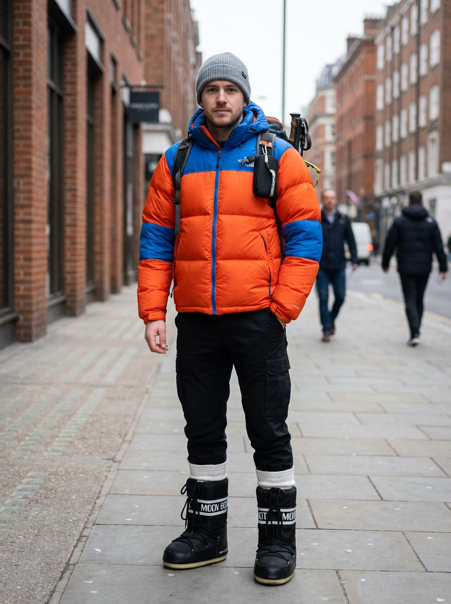 model wearing gorpcore aesthetic, functional outdoor clothing, bright colored puffer jacket, moonboots, beanie, white wool socks, outerwear, posing for photo in the street
