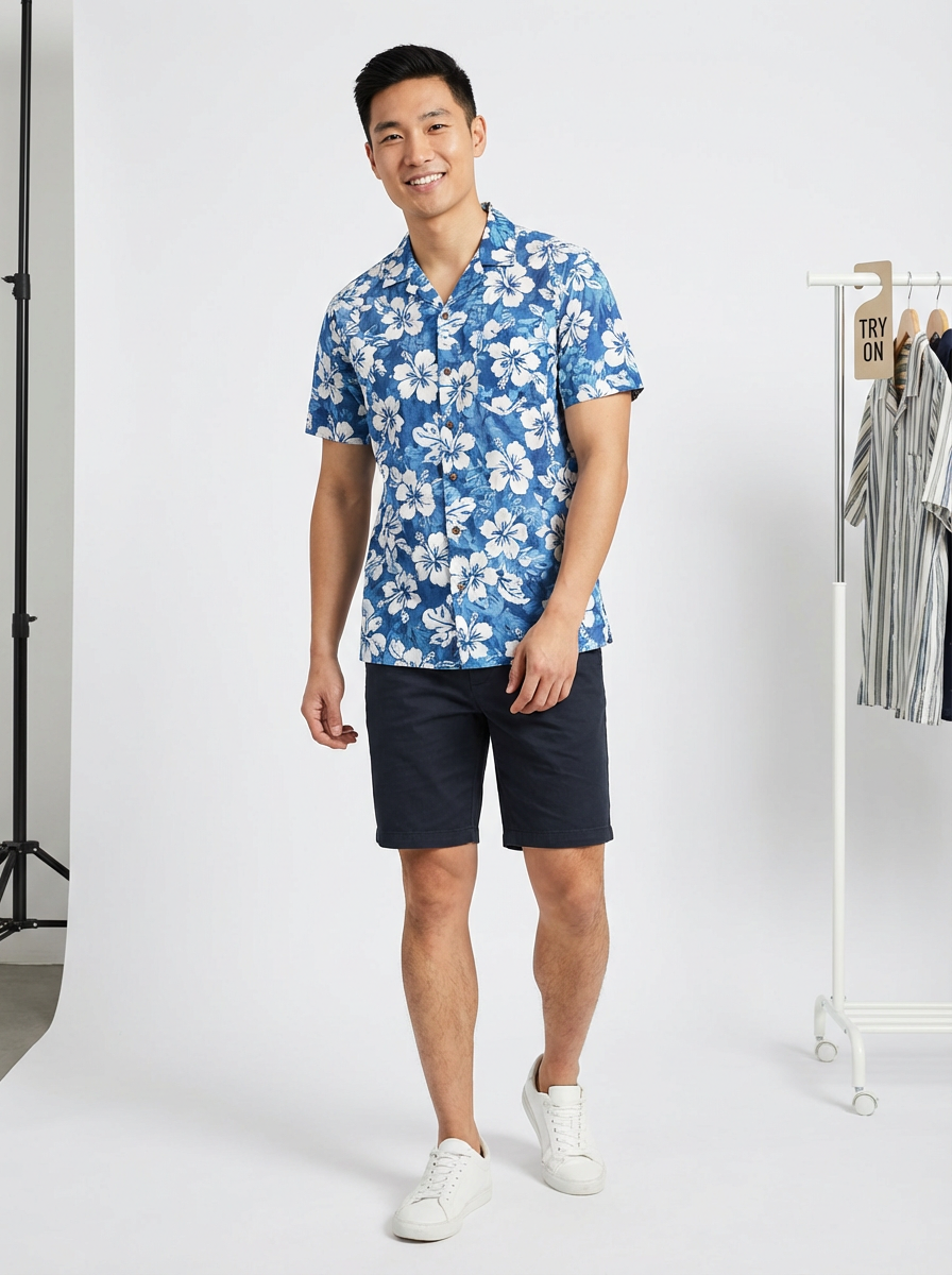 model wearing hawaii shirt in try on fashion shoot for Fast fashion brand