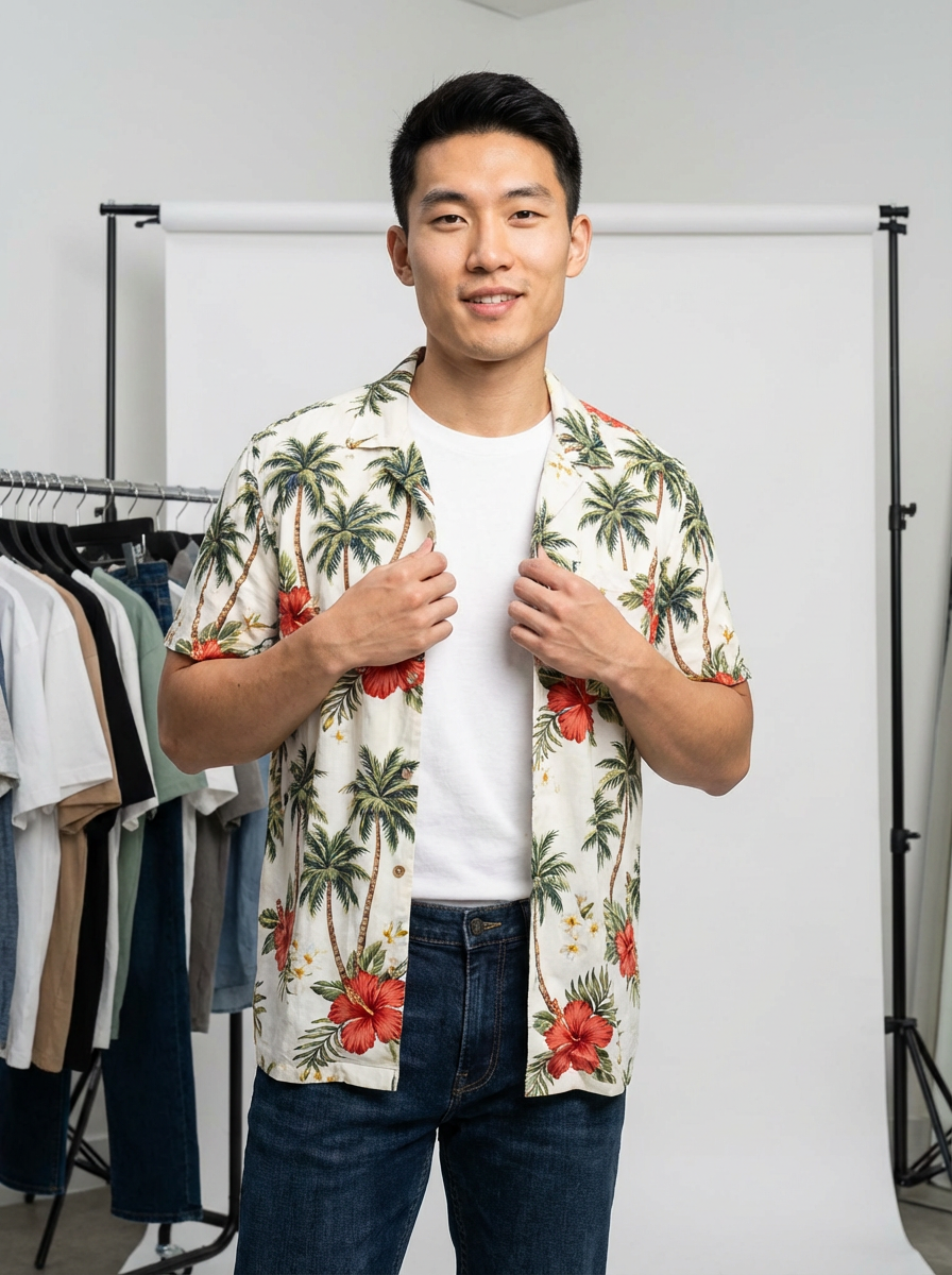 model wearing hawaii shirt in try on fashion shoot for Fast fashion brand