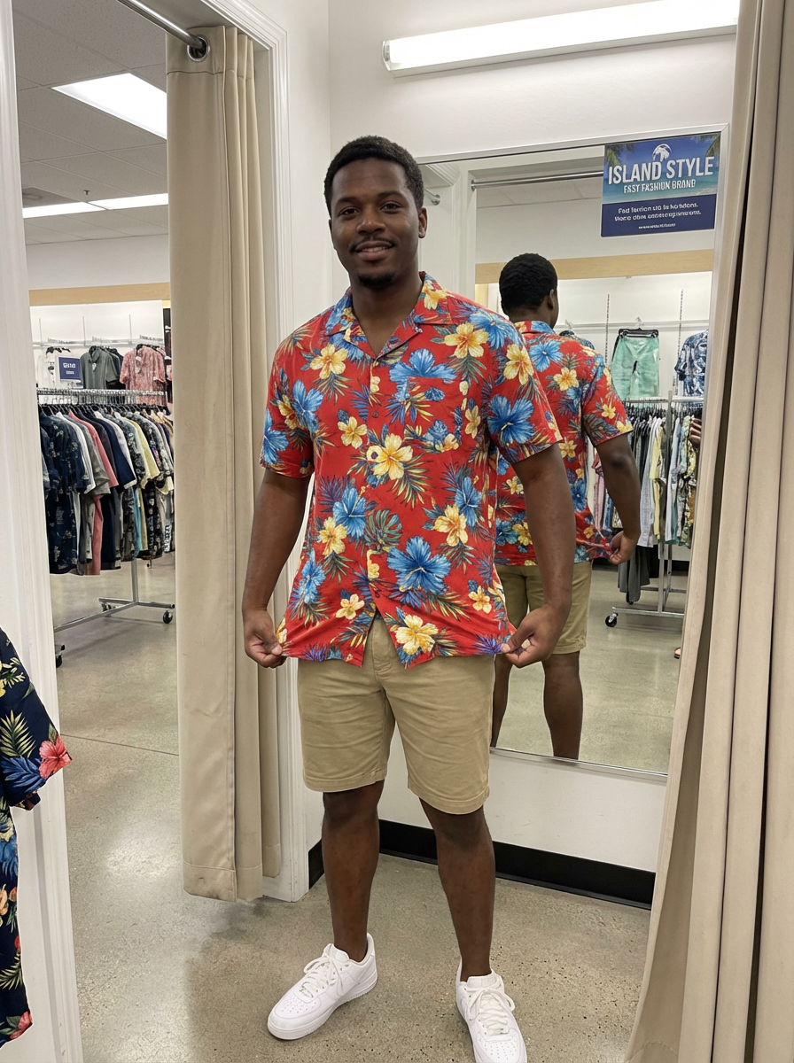 model wearing hawaii shirt in try on fashion shoot for Fast fashion brand