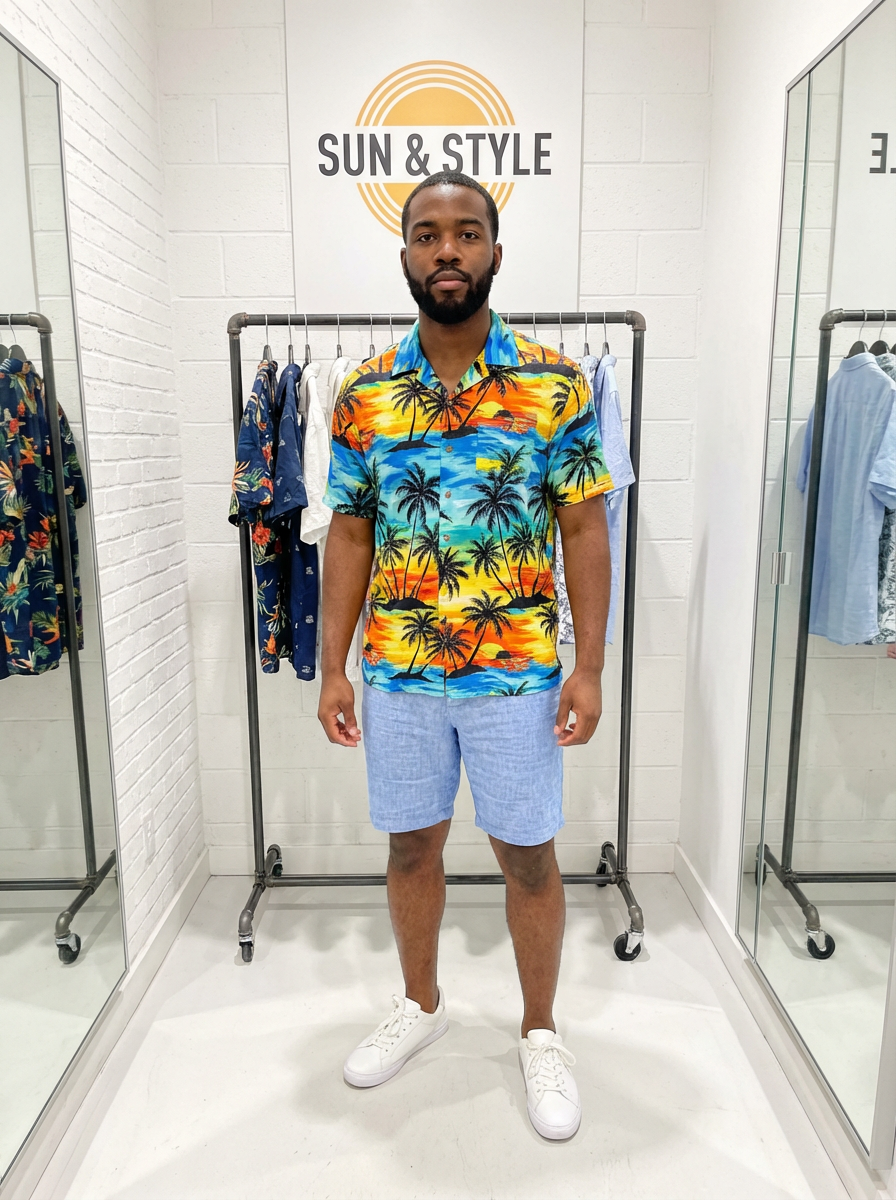 model wearing hawaii shirt in try on fashion shoot for Fast fashion brand