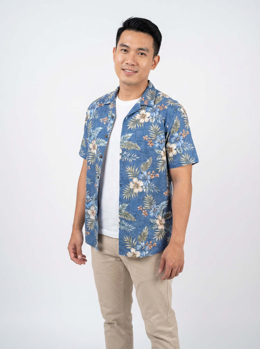 model wearing hawaii shirt in try on fashion shoot for Fast fashion brand