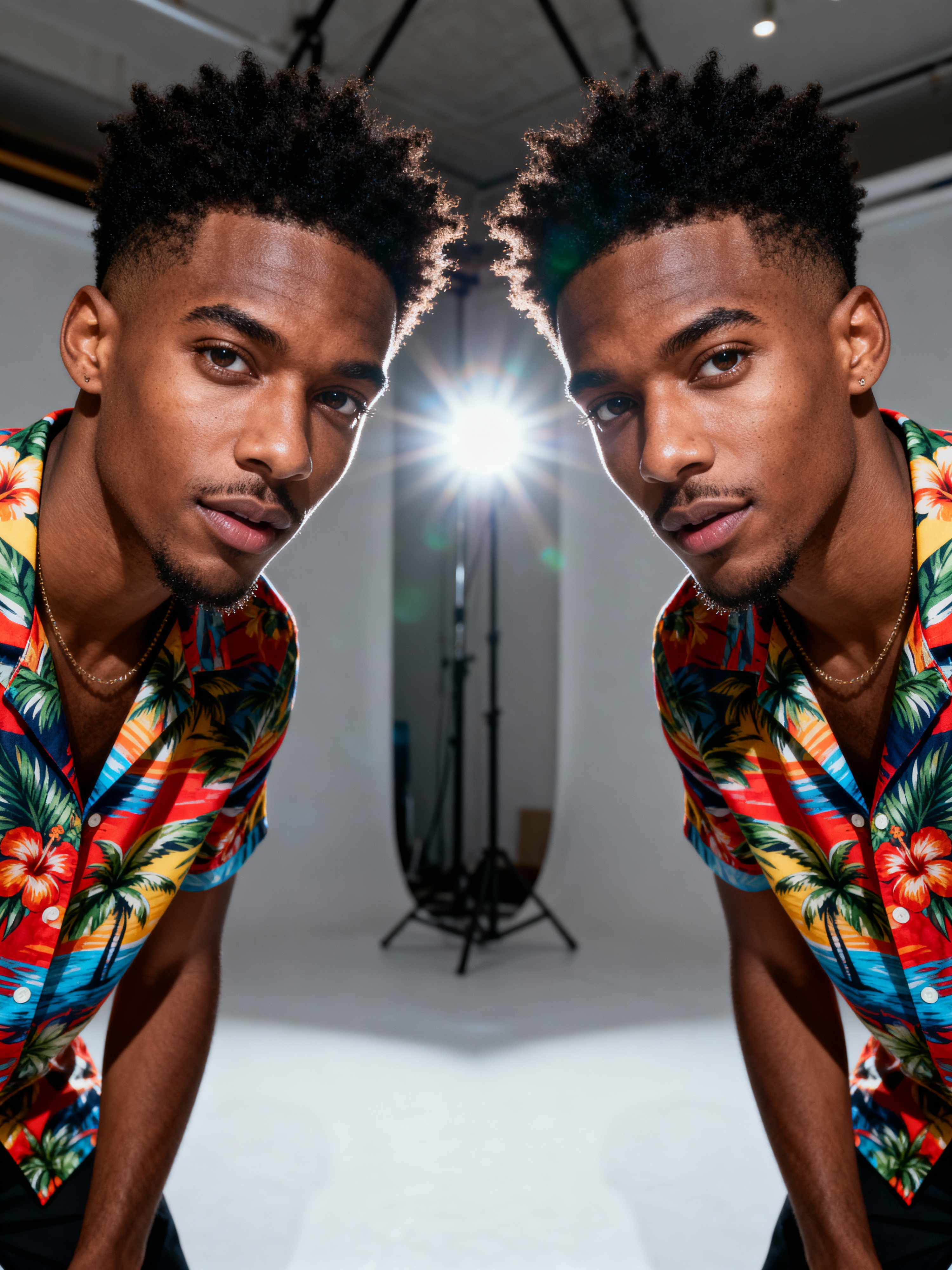 model wearing hawaii shirt in try on fashion shoot for Zara Shein H&M