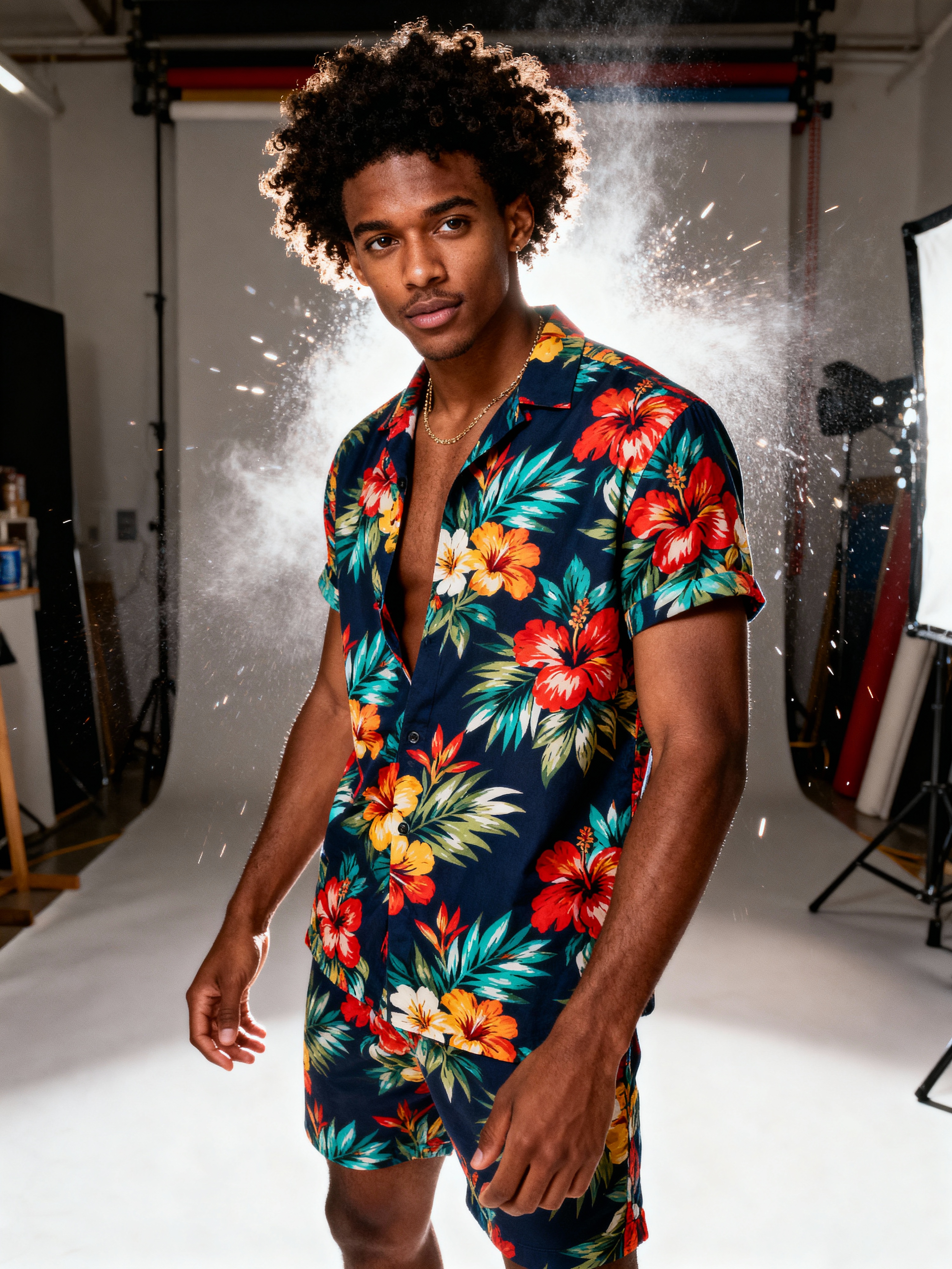 model wearing hawaii shirt in try on fashion shoot for Zara Shein H&M