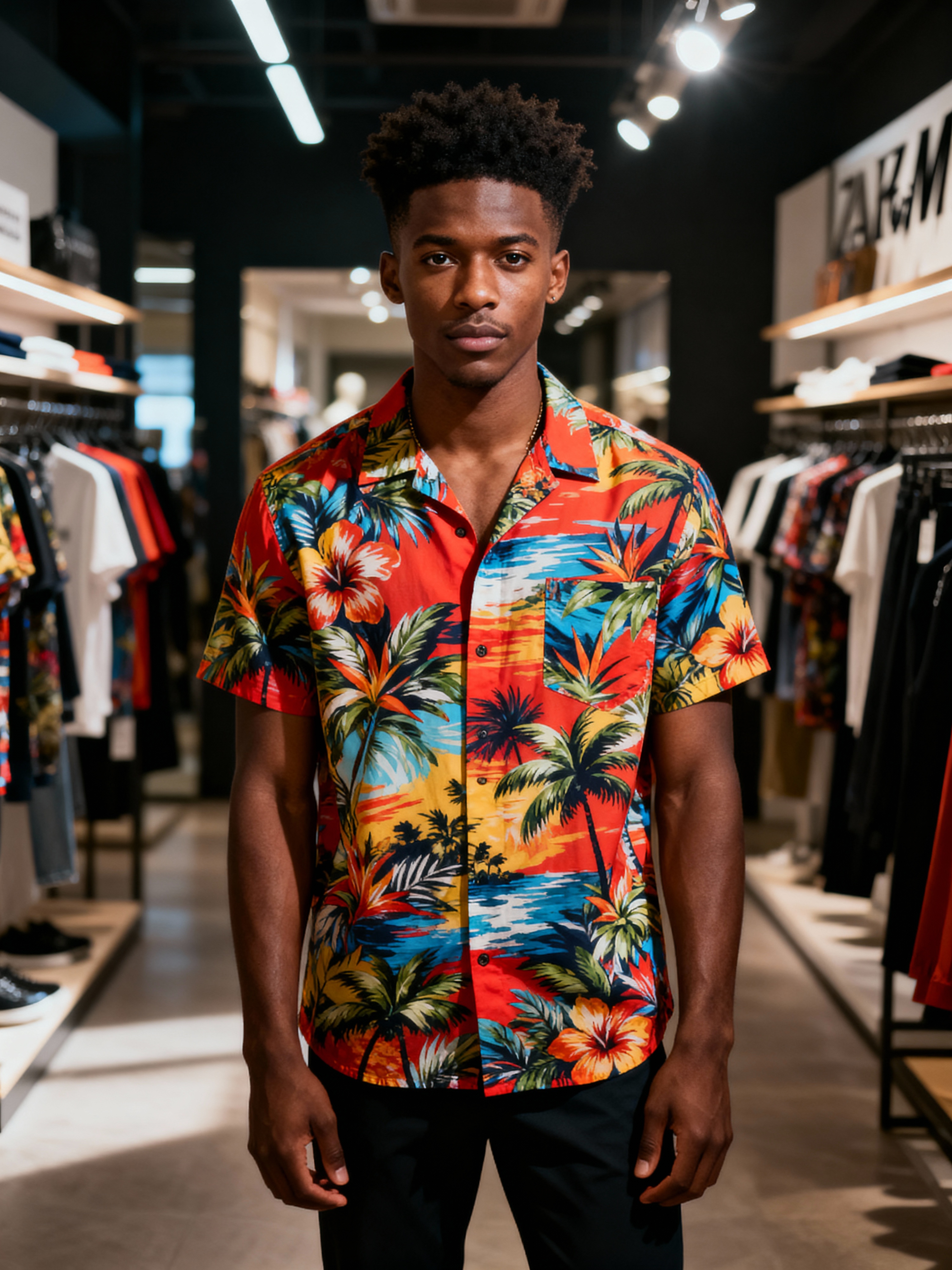 model wearing hawaii shirt in try on fashion shoot for Zara Shein H&M
