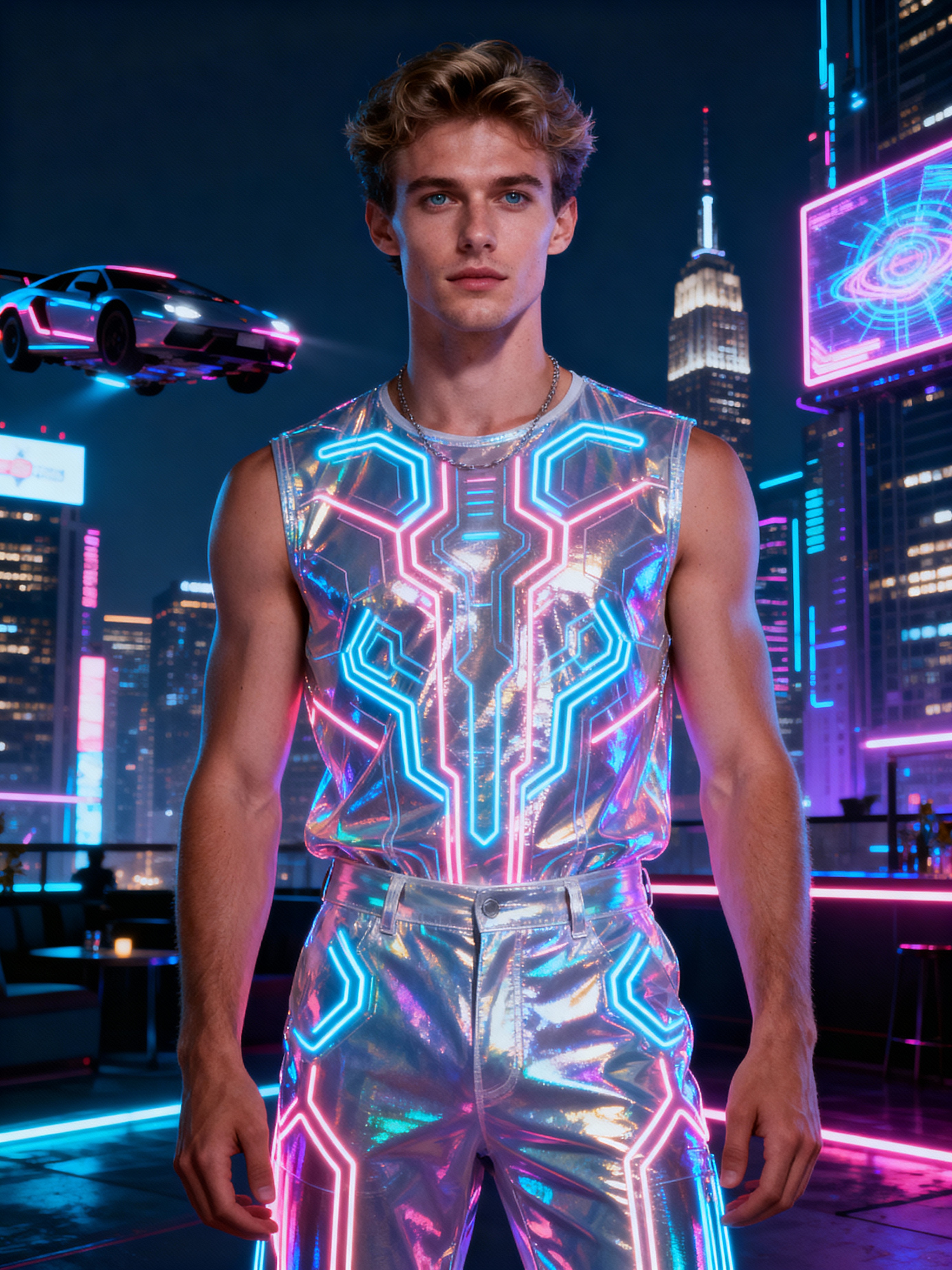 model wearing holographic nightclub outfit in a cybernetic cityscape