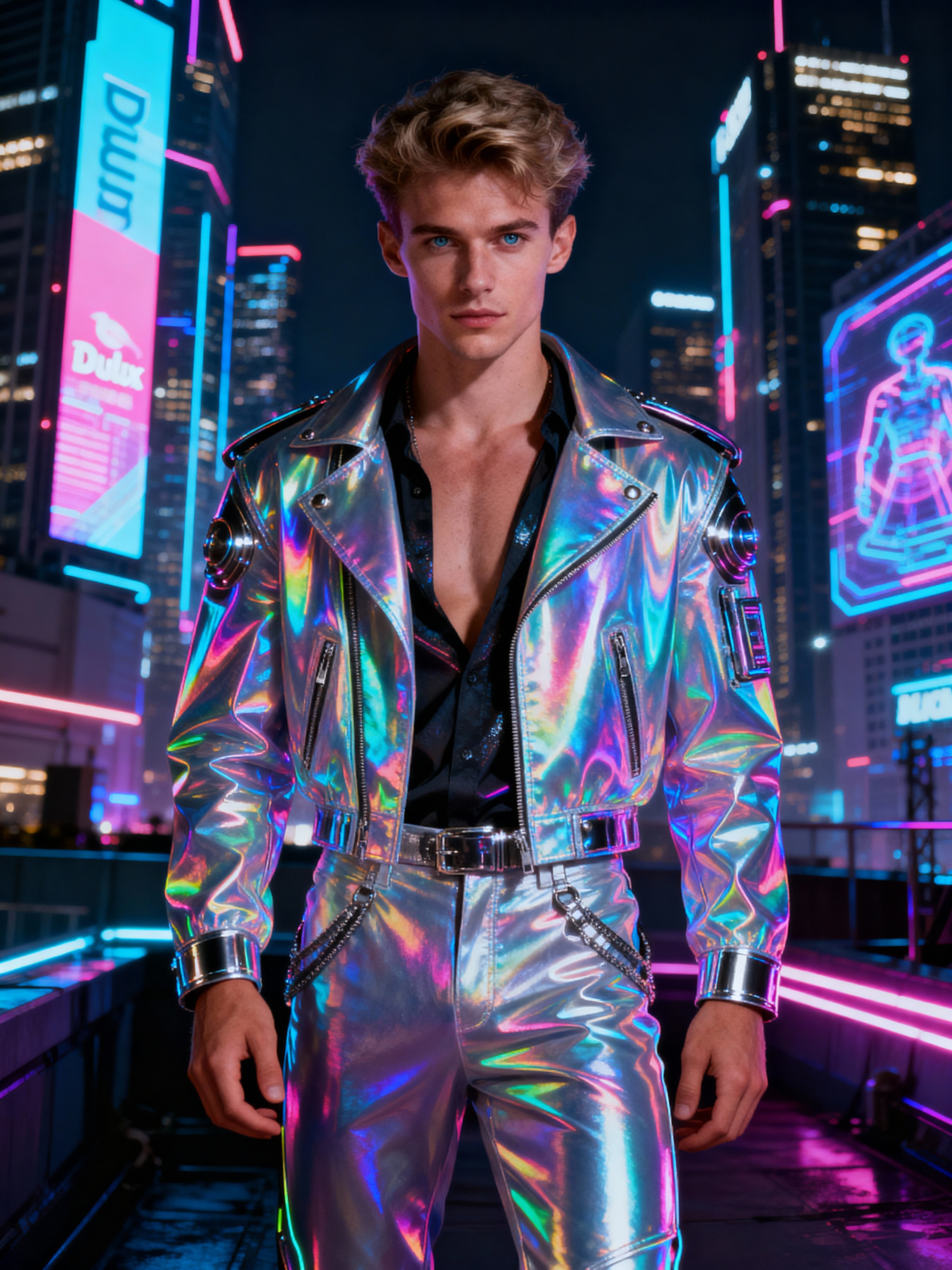 model wearing holographic nightclub outfit in a cybernetic cityscape