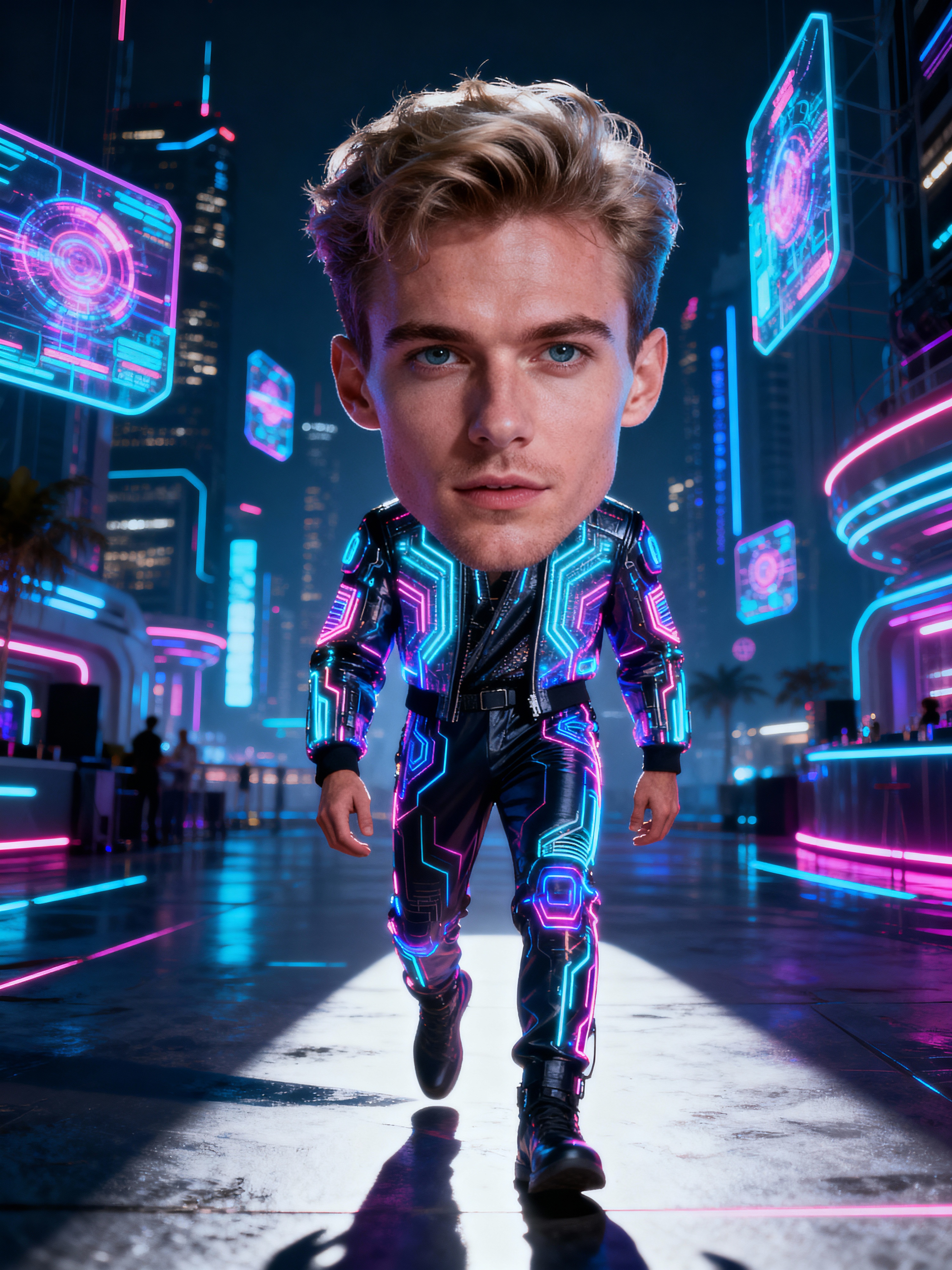 model wearing holographic nightclub outfit in a cybernetic cityscape