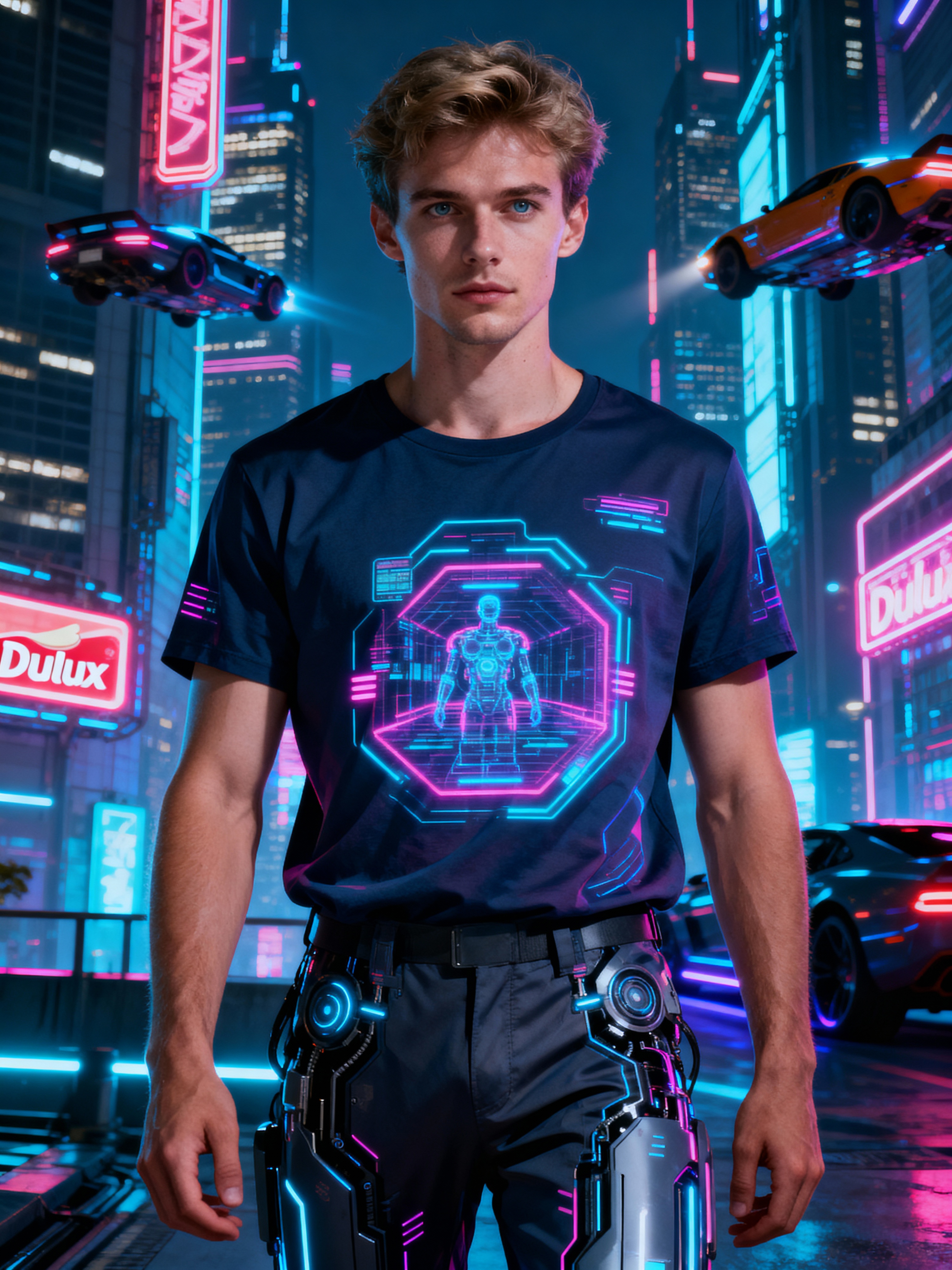 model wearing holographic t-shirt and cybernetic trousers in a neon-lit Bladerunner-inspired cityscape