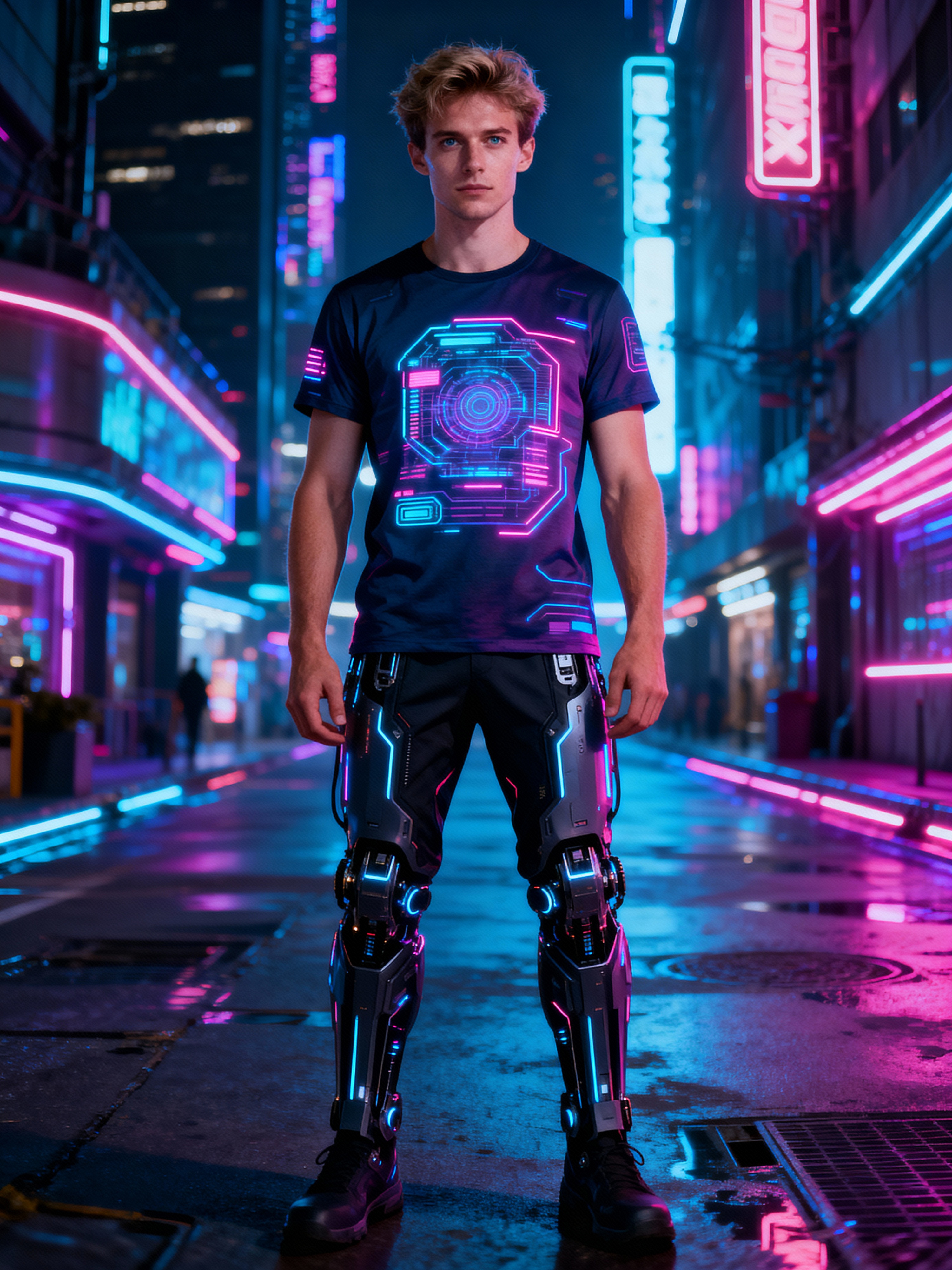 model wearing holographic t-shirt and cybernetic trousers in a neon-lit Bladerunner-inspired cityscape