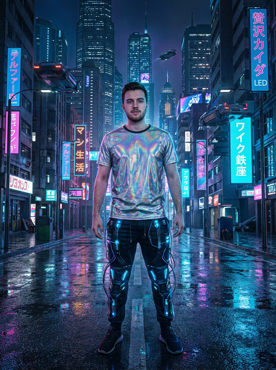 model wearing holographic t-shirt and cybernetic trousers in a neon-lit Bladerunner-inspired cityscape