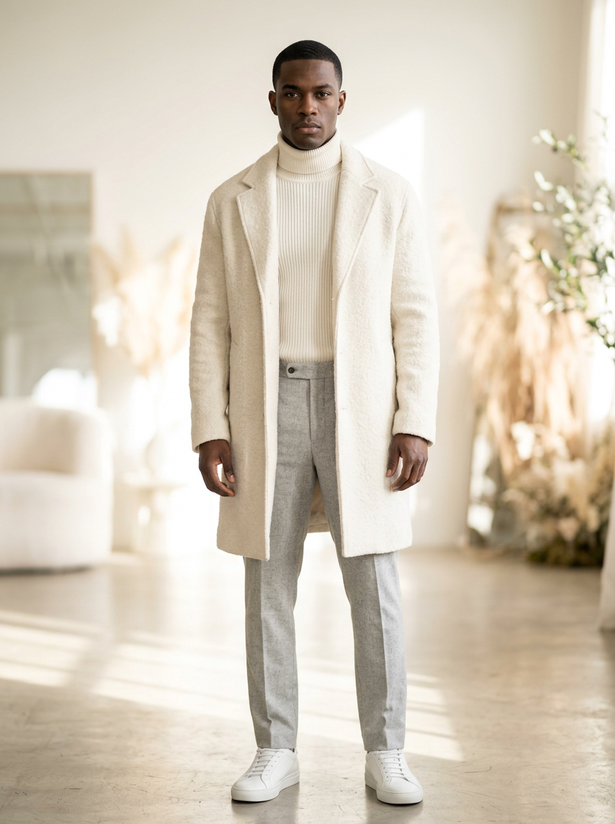 model wearing ivory turtleneck with off-white wool coat, luxurious layered whites, premium fabrics, ethereal soft-focus lighting