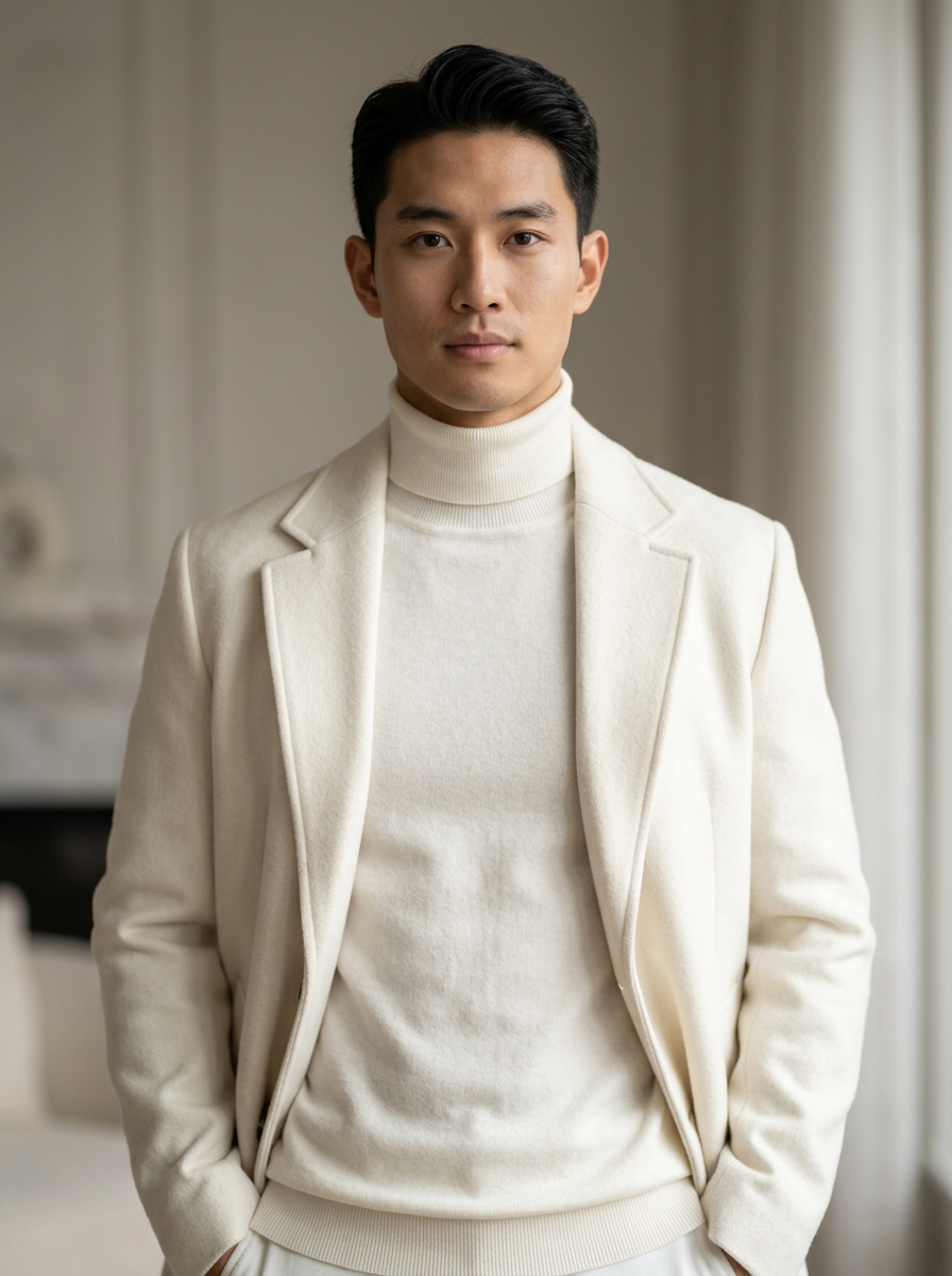 model wearing ivory turtleneck with off-white wool coat, luxurious layered whites, premium fabrics, ethereal soft-focus lighting
