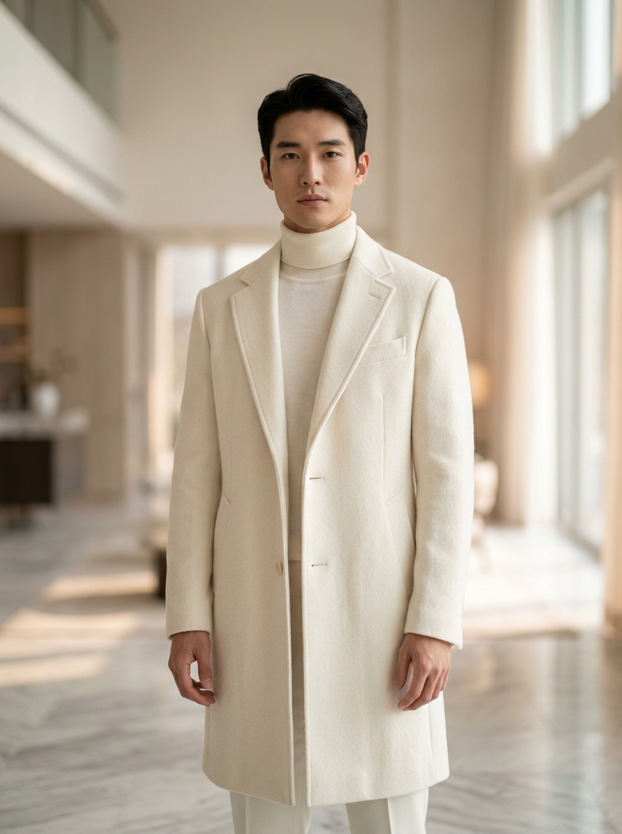 model wearing ivory turtleneck with off-white wool coat, luxurious layered whites, premium fabrics, ethereal soft-focus lighting