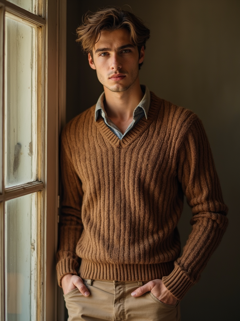 model wearing mocha brown sweater and tan chinos, luxurious textures, rich earth tones, sophisticated styling, warm natural lighting