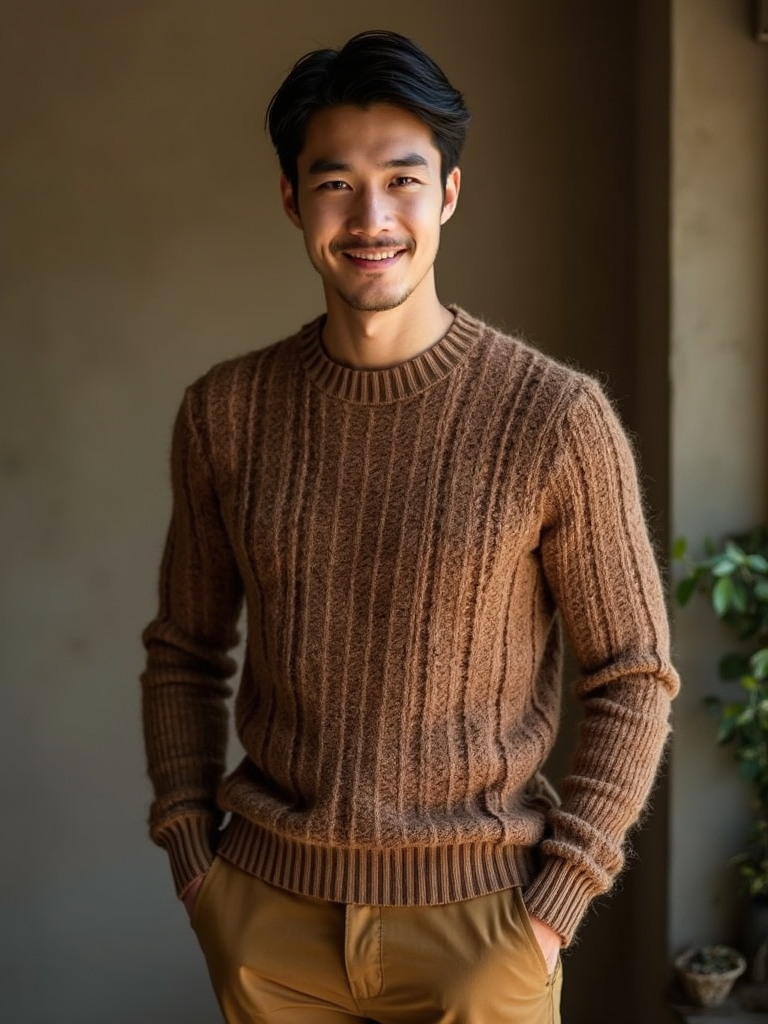 model wearing mocha brown sweater and tan chinos, luxurious textures, rich earth tones, sophisticated styling, warm natural lighting