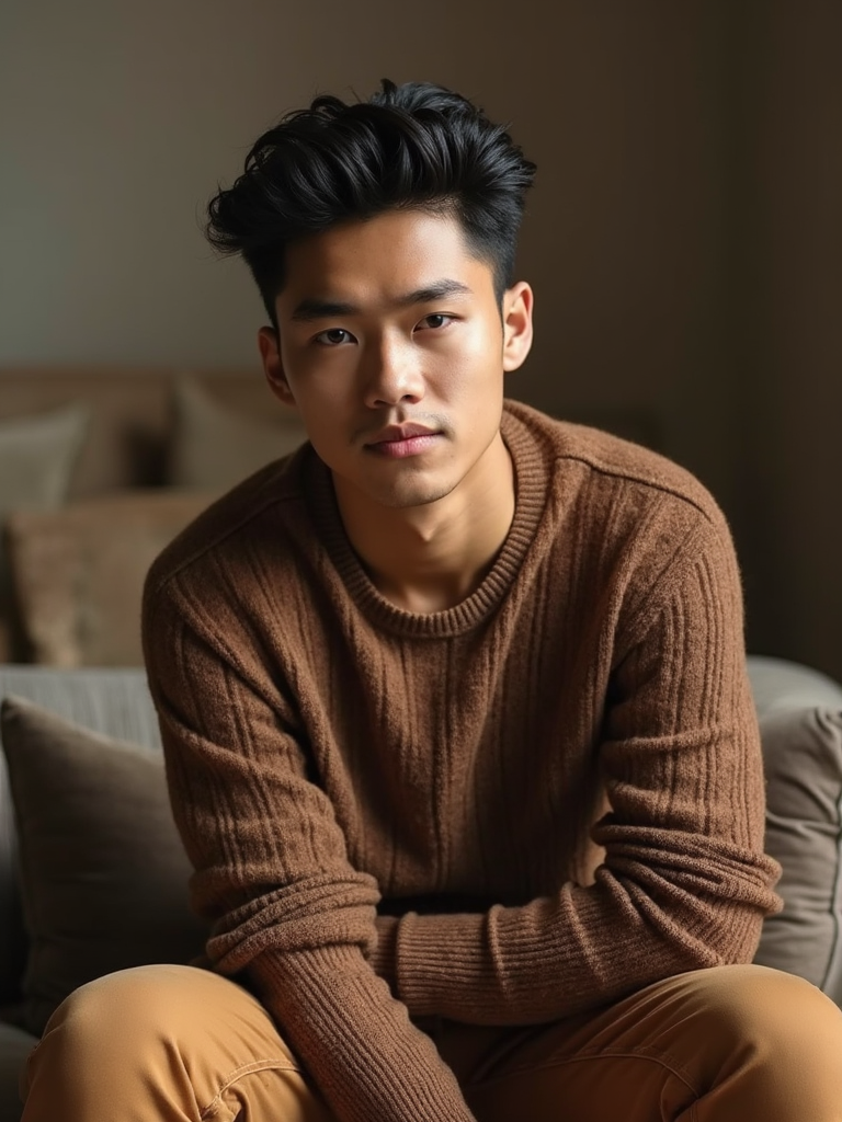 model wearing mocha brown sweater and tan chinos, luxurious textures, rich earth tones, sophisticated styling, warm natural lighting