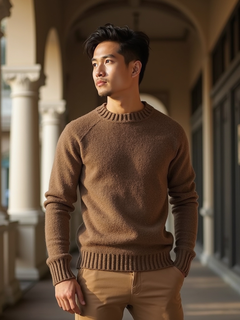 model wearing mocha brown sweater and tan chinos, luxurious textures, rich earth tones, sophisticated styling, warm natural lighting