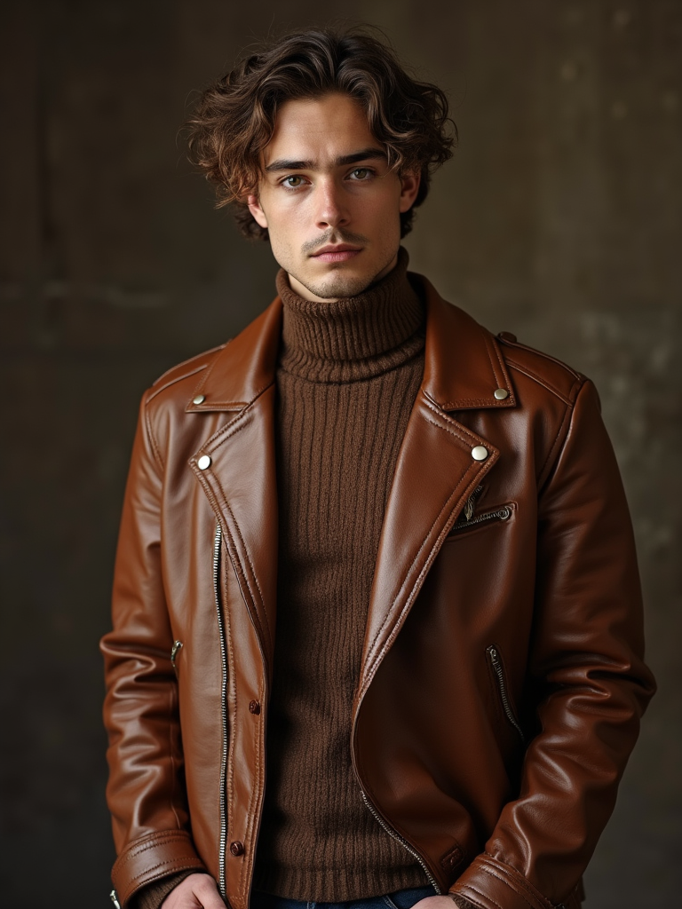 model wearing mocha turtleneck with brown leather jacket, monochromatic brown styling, luxurious textures, professional lighting