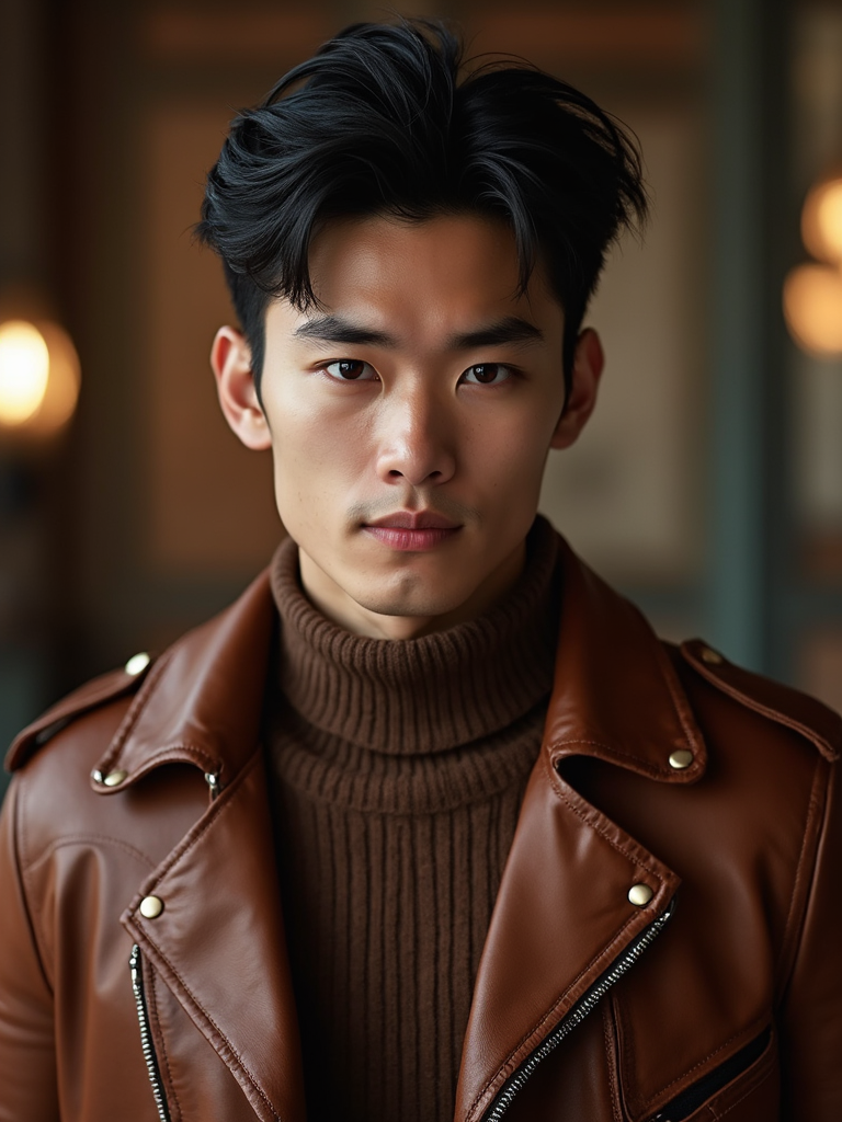 model wearing mocha turtleneck with brown leather jacket, monochromatic brown styling, luxurious textures, professional lighting