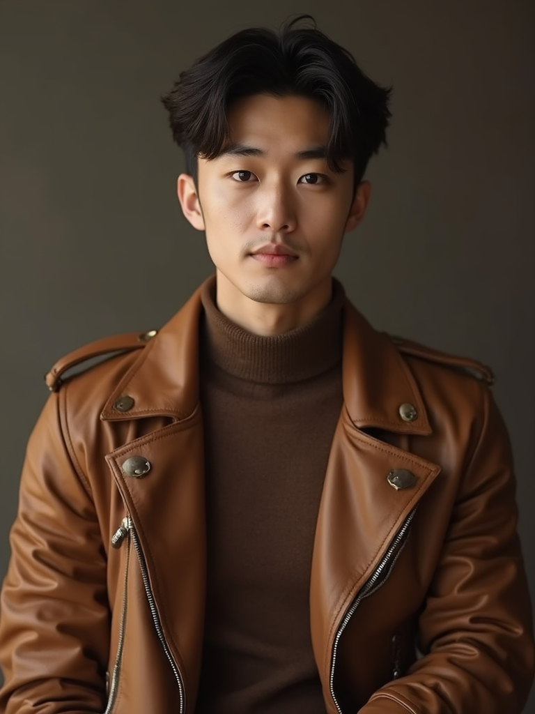 model wearing mocha turtleneck with brown leather jacket, monochromatic brown styling, luxurious textures, professional lighting