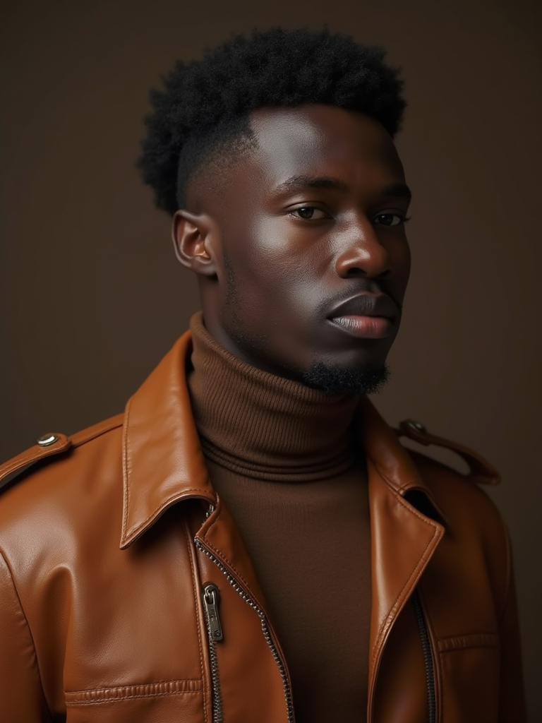 model wearing mocha turtleneck with brown leather jacket, monochromatic brown styling, luxurious textures, professional lighting