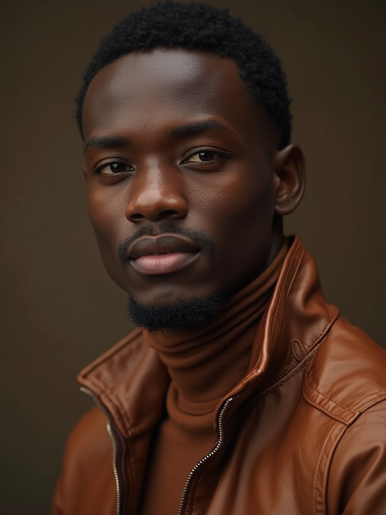 model wearing mocha turtleneck with brown leather jacket, monochromatic brown styling, luxurious textures, professional lighting