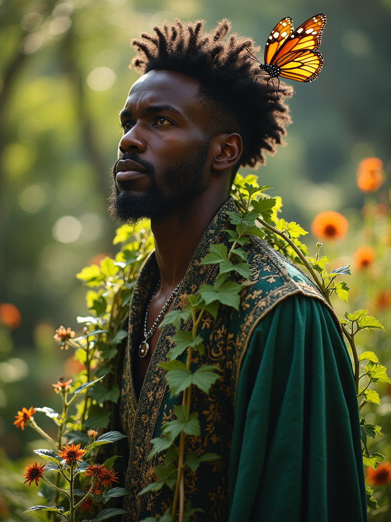model wearing nature magic robes with growing vines in an enchanted garden where flowers glow and butterflies have rainbow wings under soft dreamy lighting