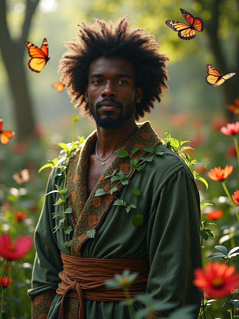 model wearing nature magic robes with growing vines in an enchanted garden where flowers glow and butterflies have rainbow wings under soft dreamy lighting