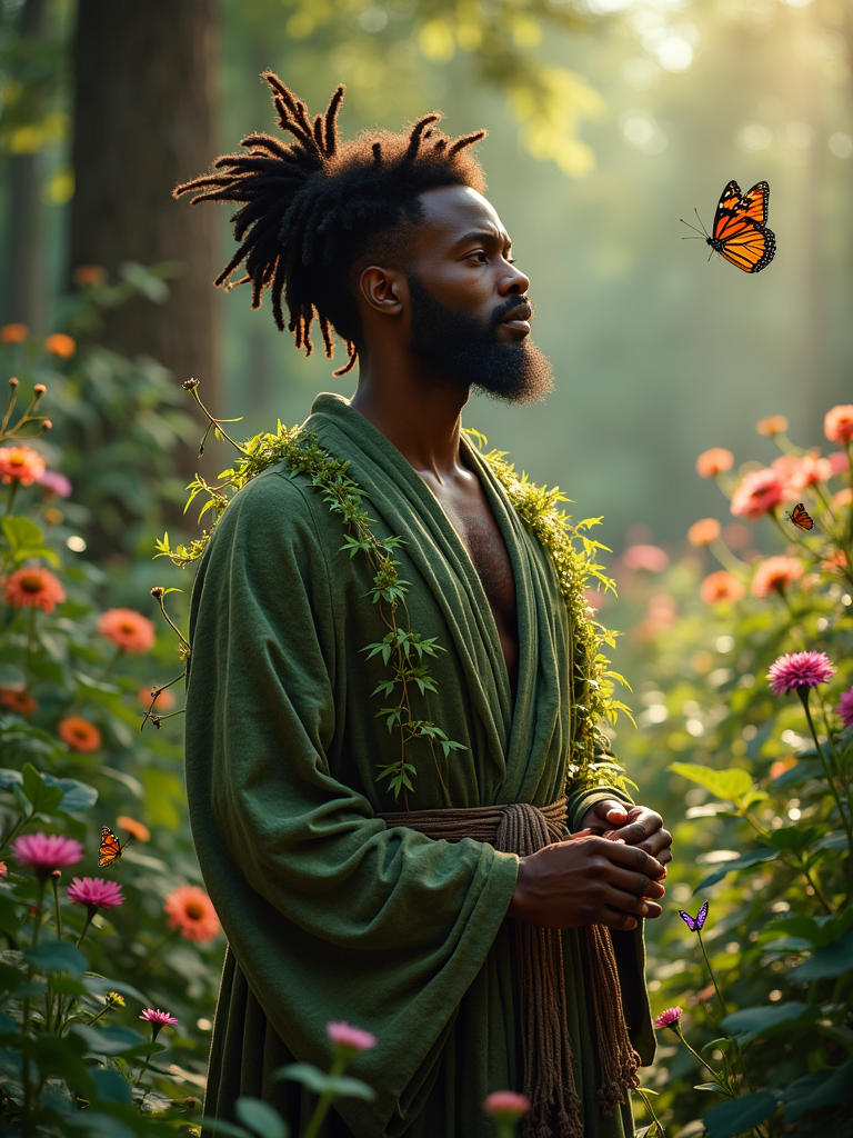 model wearing nature magic robes with growing vines in an enchanted garden where flowers glow and butterflies have rainbow wings under soft dreamy lighting