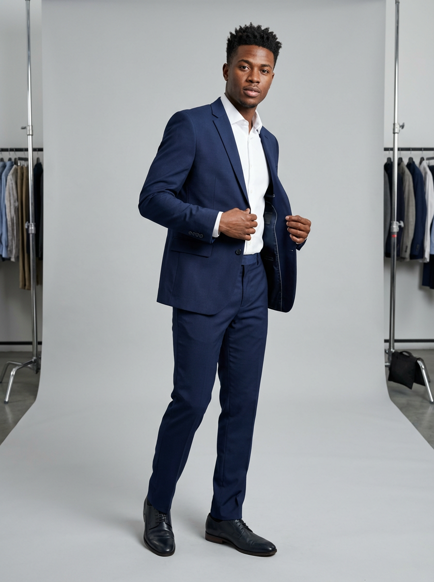 model wearing navy colored suit in try on fashion shoot for Fast fashion brand