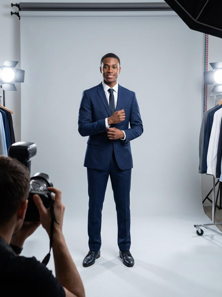 model wearing navy colored suit in try on fashion shoot for Fast fashion brand