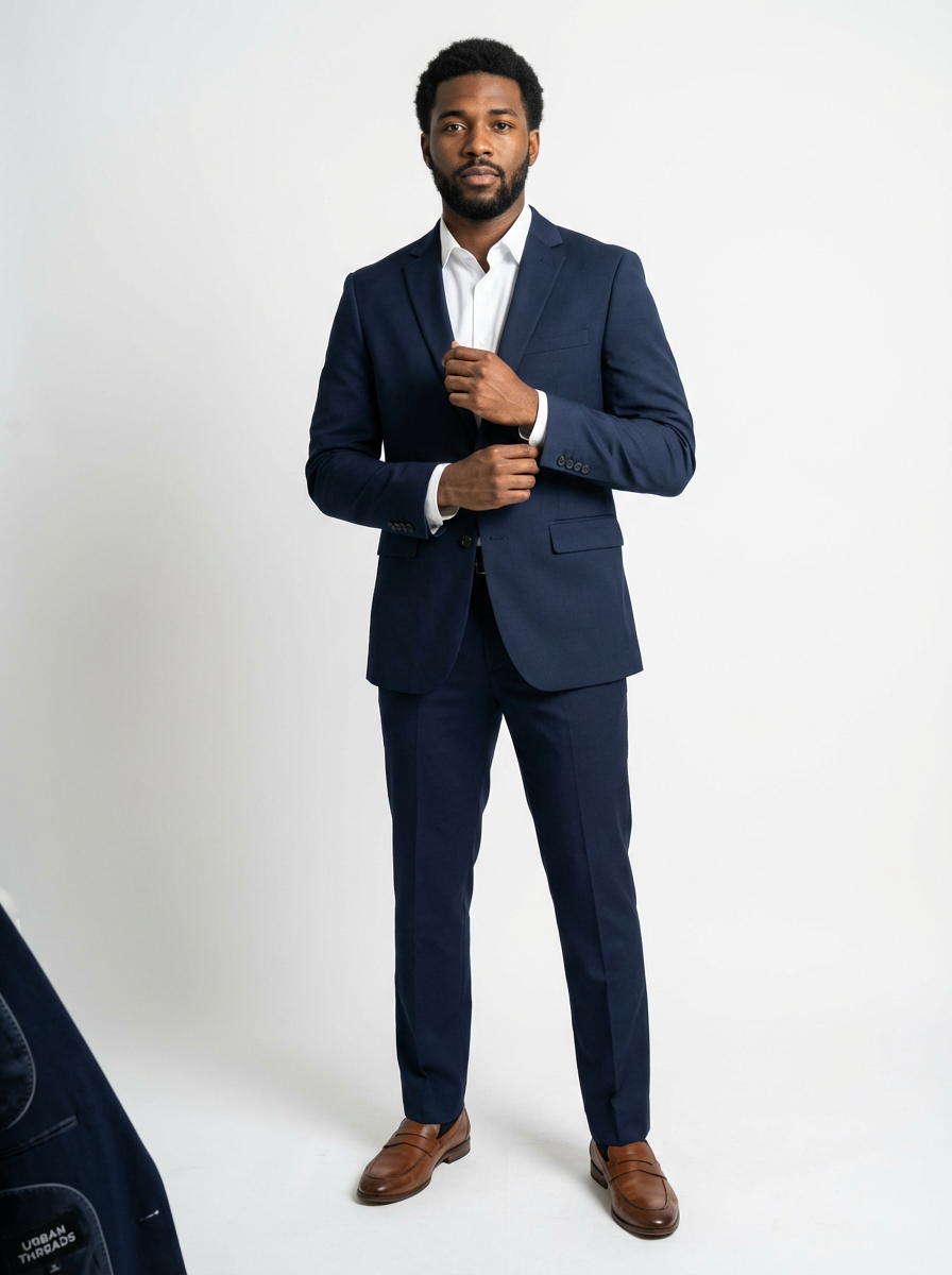 model wearing navy colored suit in try on fashion shoot for Fast fashion brand