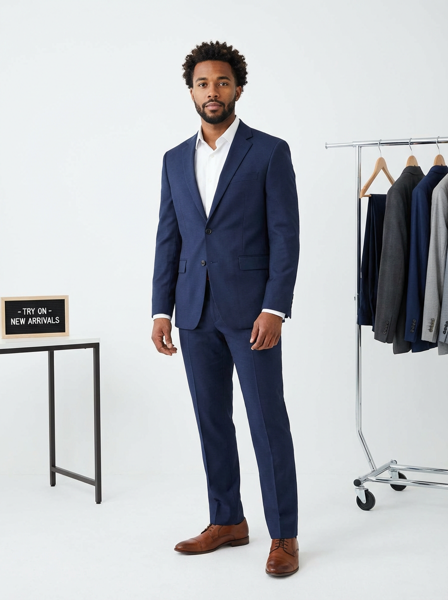 model wearing navy colored suit in try on fashion shoot for Fast fashion brand