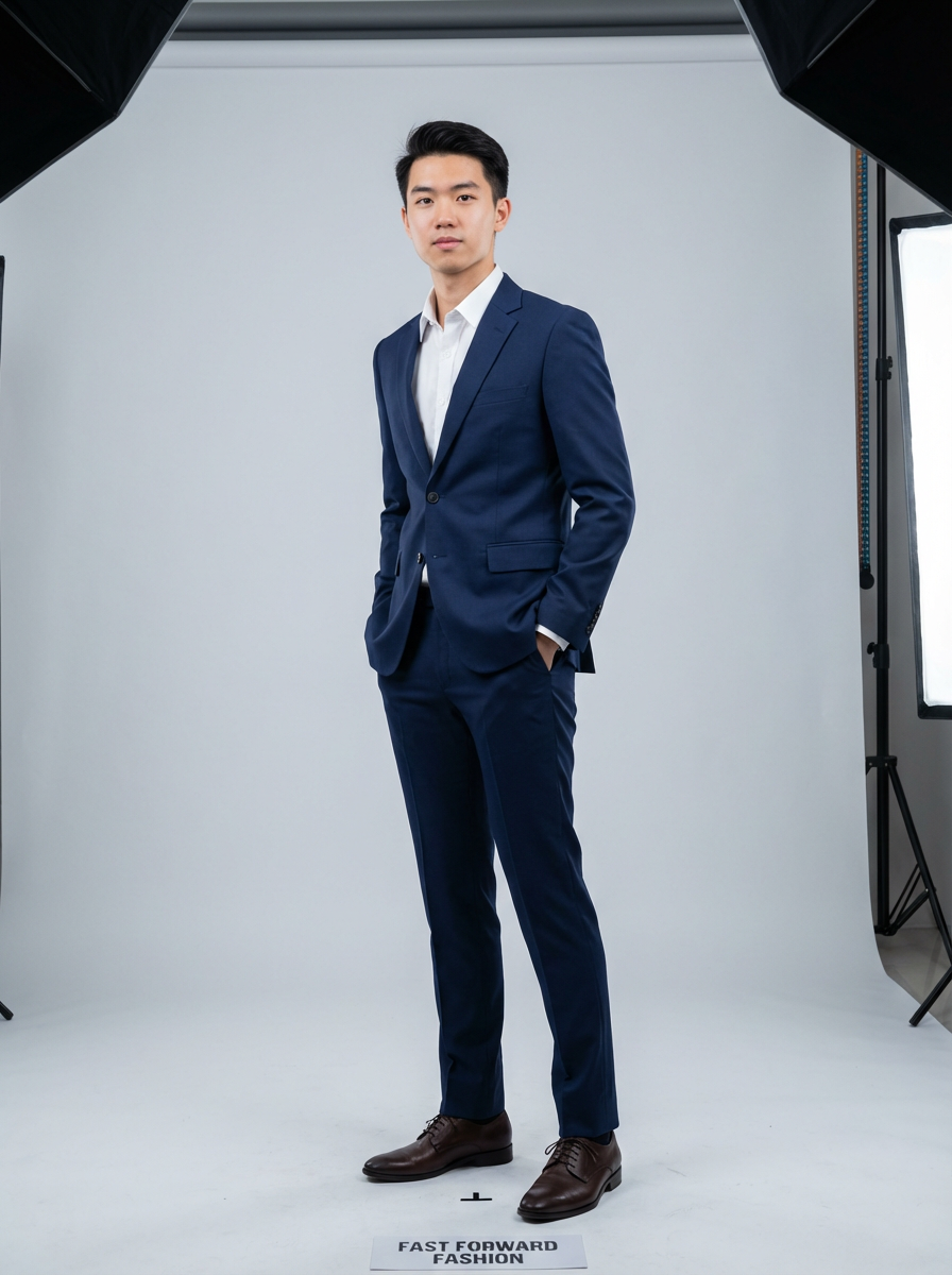model wearing navy colored suit in try on fashion shoot for Fast fashion brand
