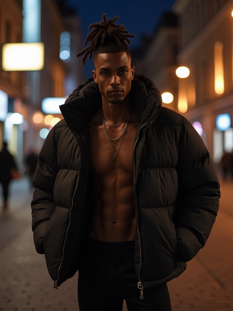model, wearing oversized black puffer coat outside night club in berlin at night. underneath puffer coat he is shirtless and wears black shorts, hair in a knot