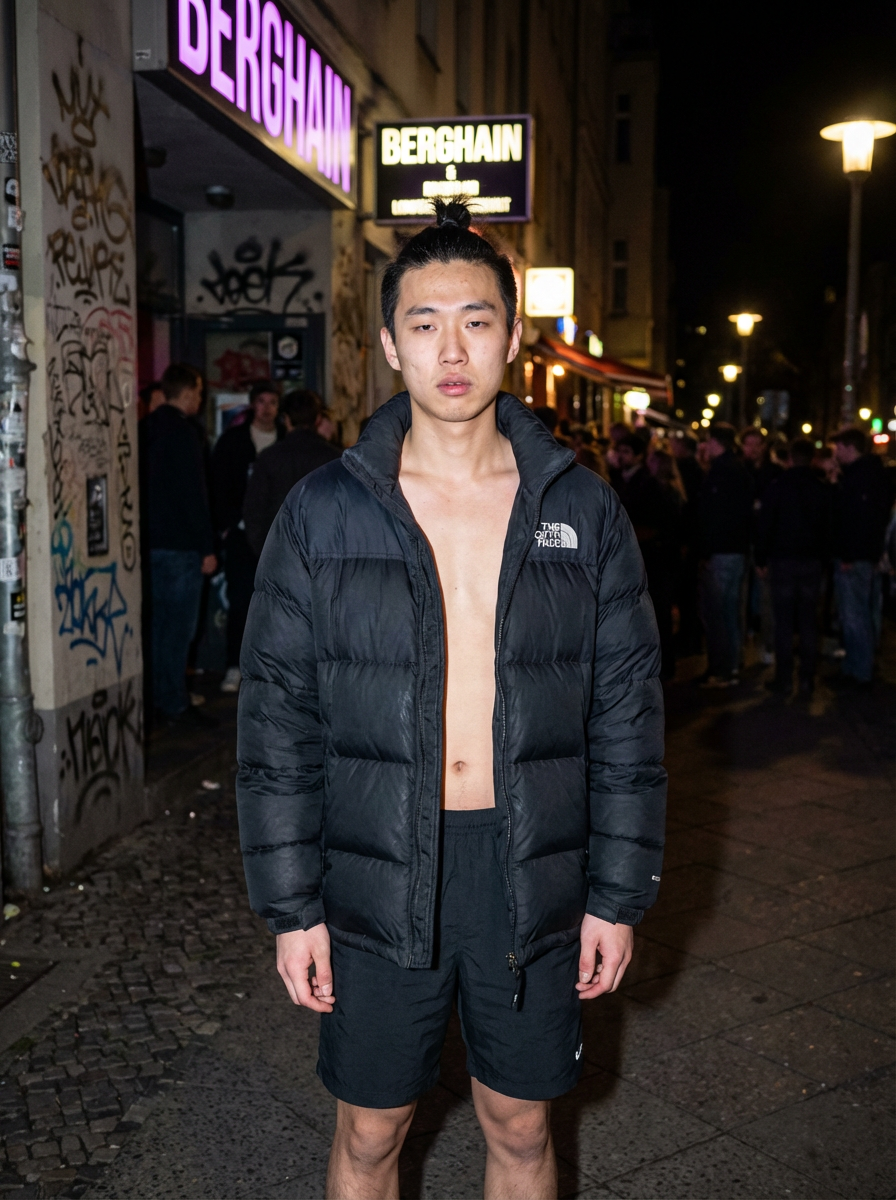 model, wearing oversized black puffer coat outside night club in berlin at night. underneath puffer coat he is shirtless and wears black shorts, hair in a knot