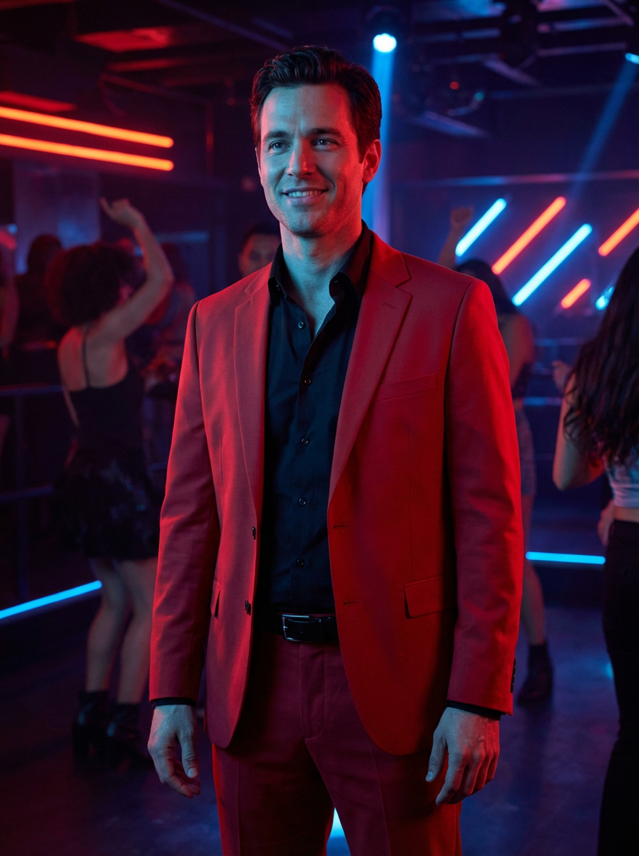 model wearing (red suit) in night club neon lights