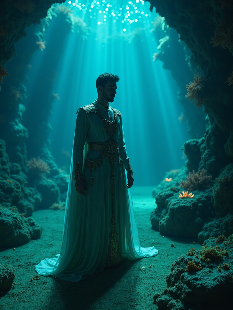 model wearing royal underwater kingdom attire in an underwater fairy palace with coral formations and bioluminescent sea creatures creating magical blue-green lighting