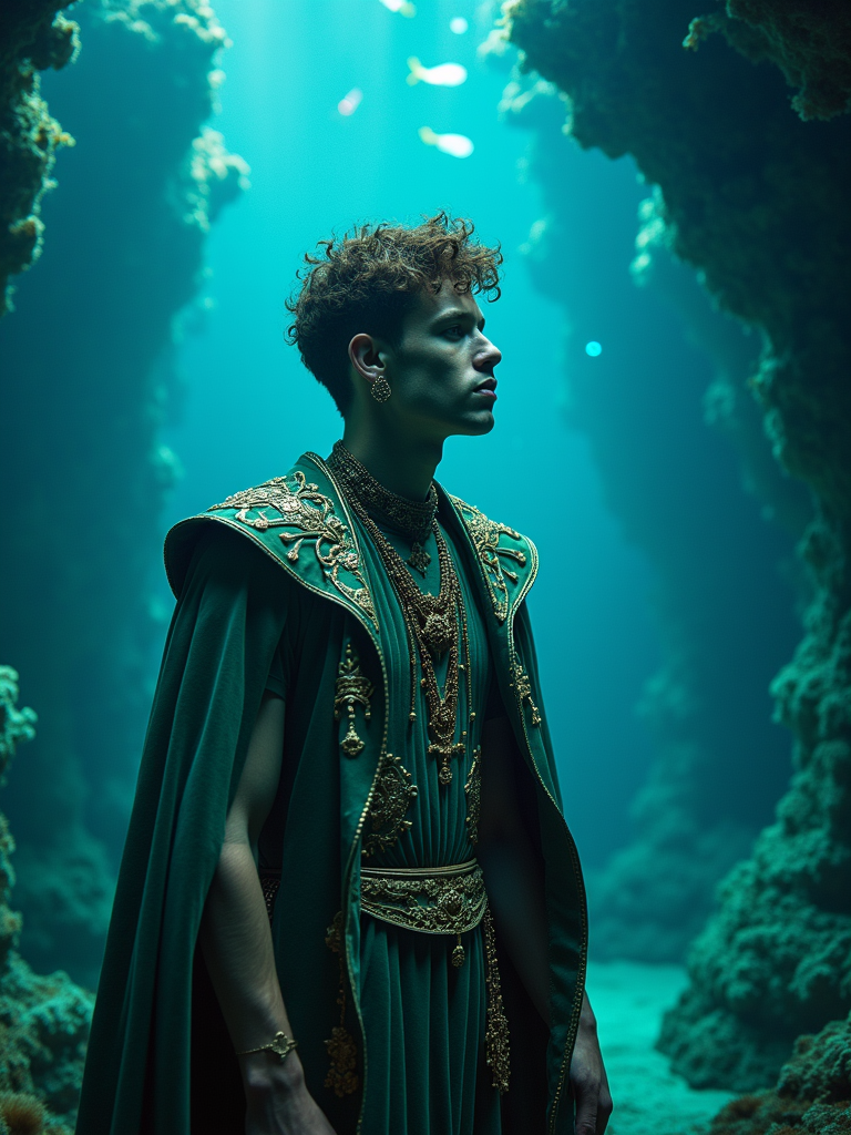 model wearing royal underwater kingdom attire in an underwater fairy palace with coral formations and bioluminescent sea creatures creating magical blue-green lighting