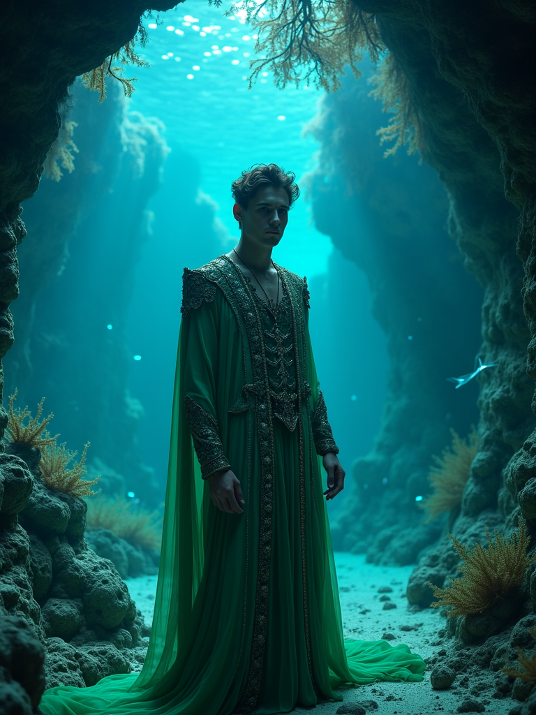 model wearing royal underwater kingdom attire in an underwater fairy palace with coral formations and bioluminescent sea creatures creating magical blue-green lighting