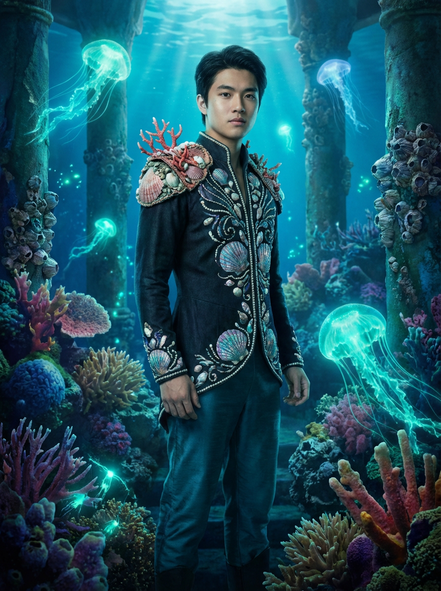 model wearing royal underwater kingdom attire in an underwater fairy palace with coral formations and bioluminescent sea creatures creating magical blue-green lighting
